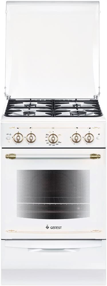 Габариты, ШхГхВ, см: 50×58.5×85; Цвет: белый, с рисунком "ретро"; Дизайн: ретро; Ширина, см: 50; Фасад: эмалированный; Варочная поверхность: эмалированная; Решетки стола: чугунные; Класс электробезопасности: I; Объем духовки, л: 52; Мощность горелки духовки, кВт: 3,1; Мощность гриль-горелки, кВт: 1,9; Газ-контроль духовки; Электророзжиг духовки: кнопка на панели; Электророзжиг горелок стола: кнопка на панели; Гриль: газовый; Подсветка духовки; Направляющие духовки: съемные проволочные; Терморегулятор (термостат); Ящик для посуды и принадлежностей: выдвижной; Ножки регулировочные; Сетевой шнур и вилка: в наличии; Стекло дверцы духовки: двойное; Комплектность: жаровня, накладка для посуды малого диаметра, противень, решетка духовки; Комплект сменных сопел