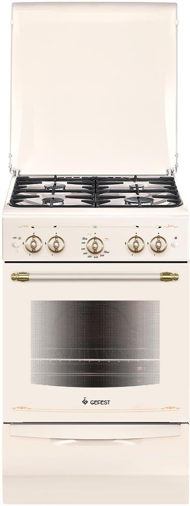 Габаритные размеры ШхГхВ: 50х58.5х85 см Цвет: кремовый. Варочная поверхность: эмалированная. Полезный объём духовки: 52 л Выдвижной ящик для посуды и принадлежностей, Съемные проволочные направляющие духовки, Газ-контроль духовки, Терморегулятор (термостат), Гриль, , Ножки регулировочные, Электророзжиг горелок, кнопка розжига на панели, Подсветка духовки двойная, Электророзжиг духовки, кнопка розжига на панели