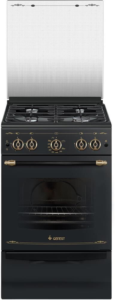 Габариты ШхГхВ: 50х58.5х85см; Ширина, см: 50; Цвет: с рисунком "ретро", черный; Дизайн: ретро; Фасад эмалированный; Варочная поверхность: эмалированная; Решетки стола: чугунные; Крышка стола: стеклянная; Класс электробезопасности: I; Газ-контроль духовки; Объем духовки, л: 52; Мощность горелки духовки, кВт: 3,1; Мощность гриль-горелки, кВт: 1,9; Электророзжиг духовки: кнопка на панели; Электророзжиг горелок стола: кнопка на панели; Гриль: газовый; Подсветка духовки; Направляющие духовки: съемные проволочные; Терморегулятор (термостат); Ящик для посуды и принадлежностей: выдвижной; Ножки регулировочные; Сетевой шнур и вилка; Стекло дверцы духовки: двойное; Комплектность: жаровня, накладка для посуды малого диаметра, противень, решетка духовки; Комплект сменных сопел