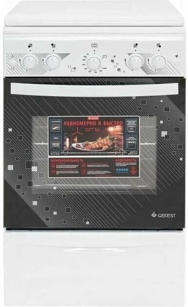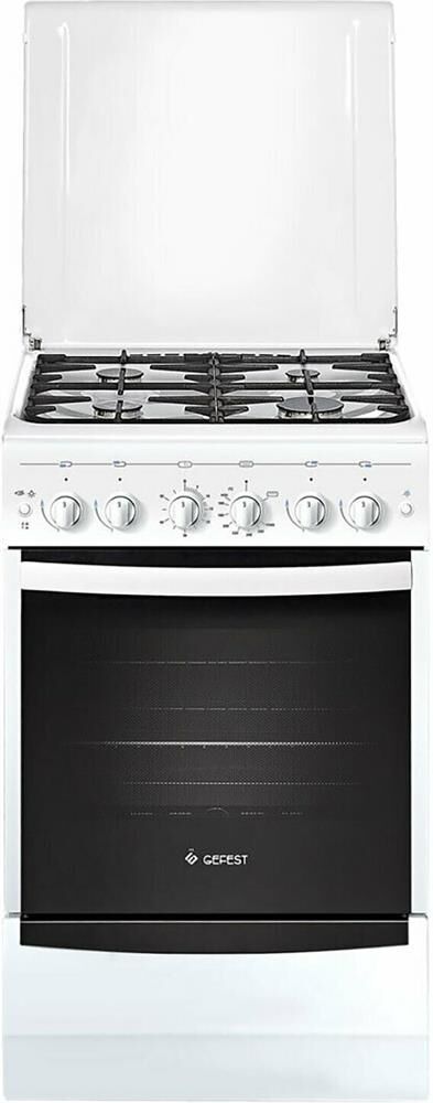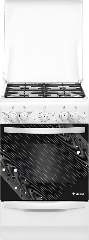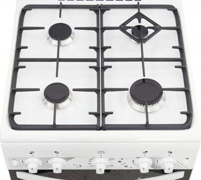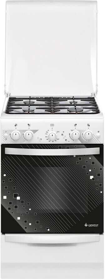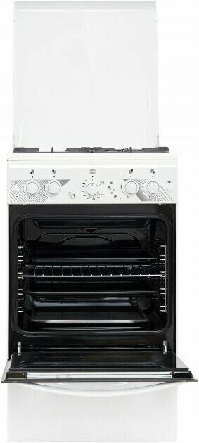 Габаритные размеры ШхГхВ: 50х58.5х85 см * Цвет: белый. Варочная поверхность: эмалированная. * Полезный объём духовки: 52 л * Выдвижной ящик для посуды и принадлежностей * Съемные проволочные направляющие духовки * Газ-контроль горелок стола * Терморегулятор (термостат) * Газ-контроль духовки * Чугунные решетки горелок стола * Гриль * Электророзжиг горелок, кнопка розжига на панели * Ножки регулировочные * Электророзжиг духовки, кнопка розжига на панели * Подсветка духовки одинарная *