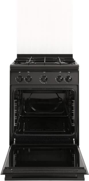 Габариты ШхГхВ, см: 50х58.5х85; Объем духового шкафа, л: 52; Тип очистки: Гидролизная; Цвет: Черный; Материал варочной поверхности: Эмаль; Материал решеток варочной поверхности: Сталь; Крышка плиты: Стеклянный щиток; Газ-контроль горелок стола; Тип направляющих духового шкафа: Съемные проволочные; Внутреннее покрытие духового шкафа: Эмаль легкой очистки SMART CERAMIC; Количество стекол в дверце духового шкафа: 2; Ящик для посуды и принадлежностей: Откидная крышка; Контроль температуры духового шкафа: Кран с безопасностью; Нижний нагрев; Жаровня: 1; Регулировочные ножки; Комплект сменных сопел; Противень: 1; Решетка варочной поверхности: 1; Решетка духового шкафа: 1; Диапазон номинального напряжения сети, В: 220-230; Номинальная частота сети, Гц: 50; Основная горелка духового шкафа, Вт: 2350