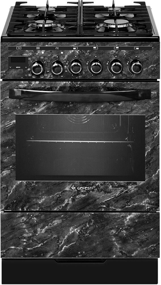 Газоэлектрическая плита. Цвет: черный с рисунком "мрамор". Варочная поверхность: стеклянная. ШхГхВ: 50х58.5х85 см. Объём духовки: 55л. Масса нетто, кг: 45.8. Диапазон номинальных напряжений, В: 220-230. Духовка: электрическая. Без крывшки. Присоединительная резьба газопровода: G1/2. Вертел с электроприводом. Выдвижной ящик для посуды и принадлежностей. Газ-контроль горелок стола. Гриль электрический. Ножки регулировочные. Подсветка духовки одинарная.Съемные проволочные направляющие духовки. Таймер сенсорный многофункциональный. Терморегулятор (термостат). Ускоренный нагрев с конвекцией. Чугунные решетки горелок стола. Шашлычница. Электророзжиг горелок, встроенный в ручки.