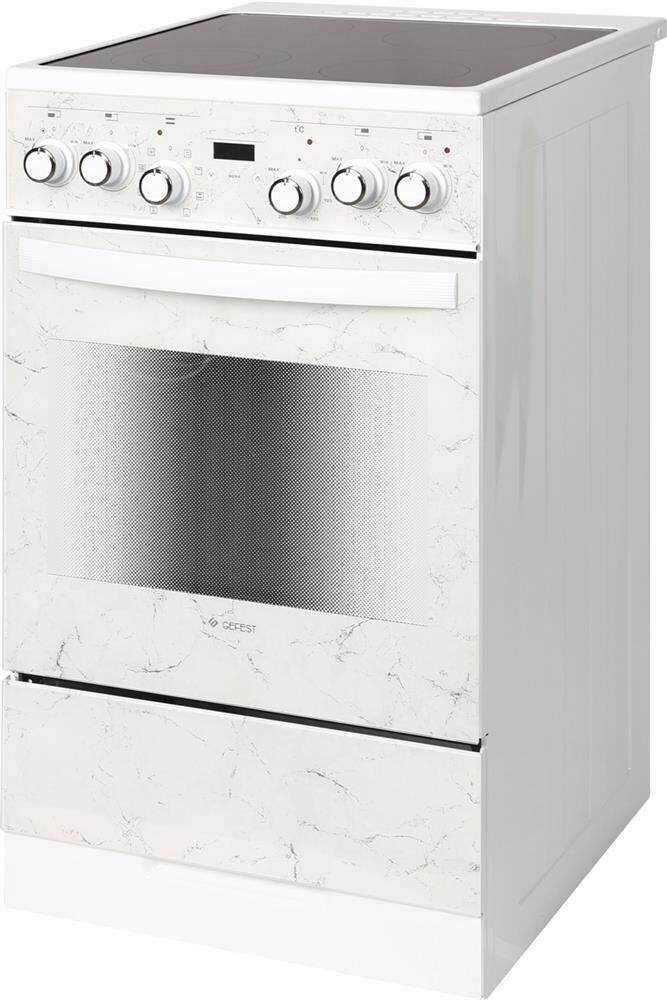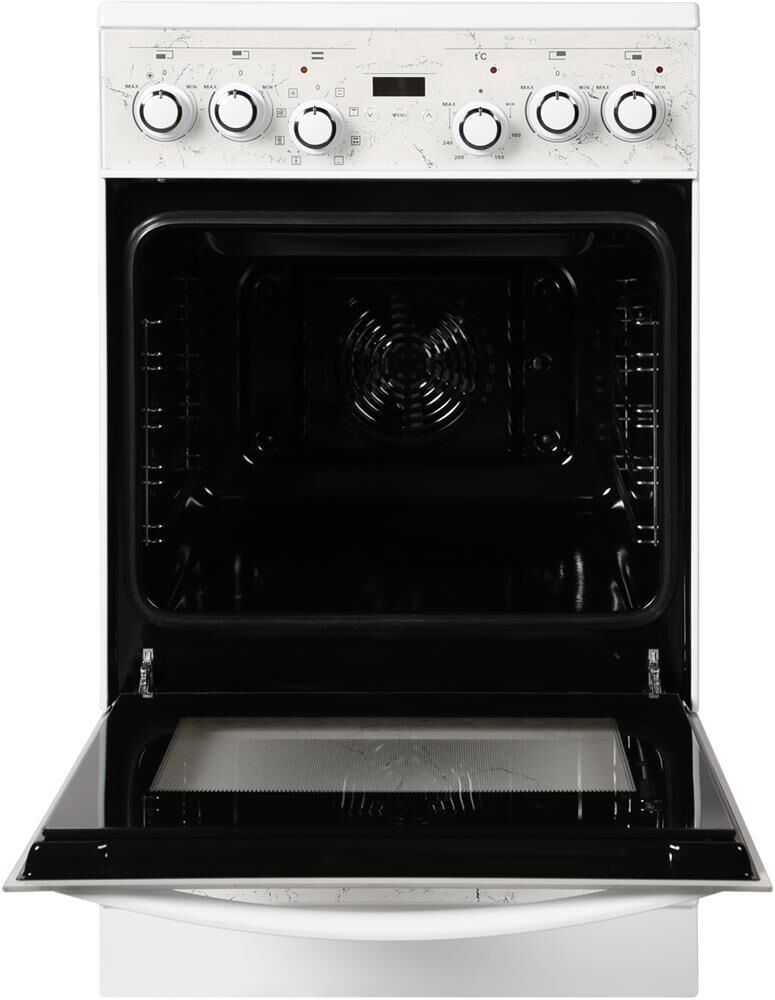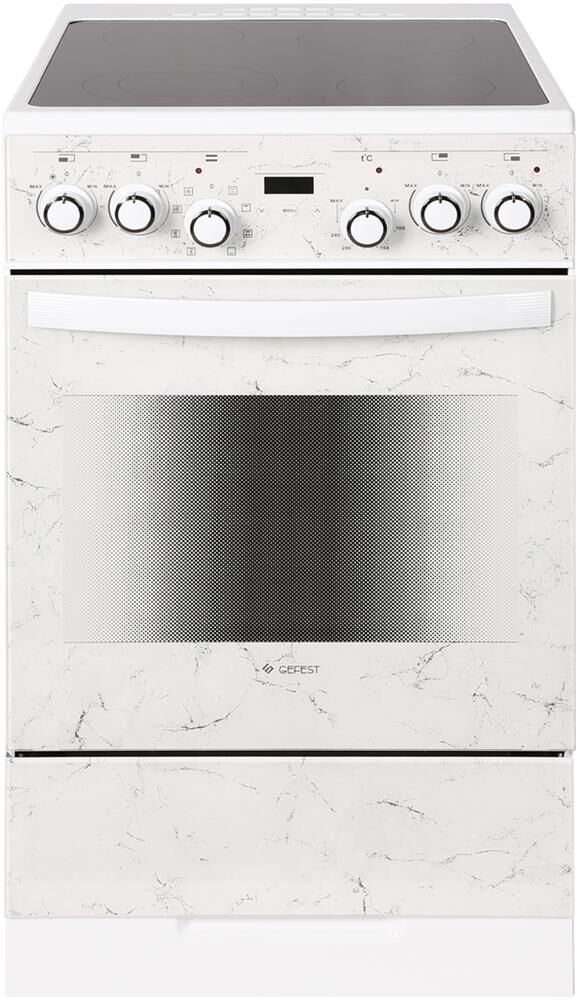 Габариты, ШхГхВ, см: 50×58.5×85; Цвет: белый, с рисунком "мрамор"; Дизайн: мрамор; Ширина, см: 50; Фасад: закаленное стекло; Варочная поверхность: стеклокерамическая; Количество зон приготовления: 4; Класс энергоэффективности: А; Диапазон номинальных напряжений, В: 220-230; Номинальная потребляемая мощность электроэнергии, кВт: 6,72-7,35; Объем духовки, л: 55; Конвекция; Мощность верхнего ТЭН духовки, кВт: 0,8; Мощность нижнего ТЭН духовки, кВт: 1,2; Мощность ТЭН вентилятора, кВт: 2,0; ТЭН-гриль: 1,2; Внутреннее покрытие духового шкафа: эмаль легкой очистки SMART CERAMIC; Управление: сенсорное , механическое; Таймер: сенсорный, многофункциональный; Двухзонные комфорки; Гриль: электрический; Вертел с электроприводом; Шашлычница; Ускоренный нагрев с конвекцией; Подсветка духовки: двойная; Направляющие духовки: съемные проволочные; Терморегулятор; Ящик для посуды и принадлежностей: выдвижной ящик; Ножки регулировочные; Сетевой шнур и вилка: в наличии