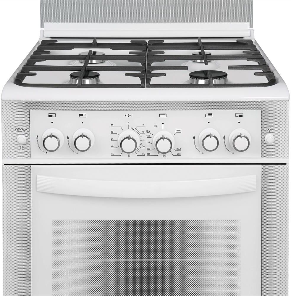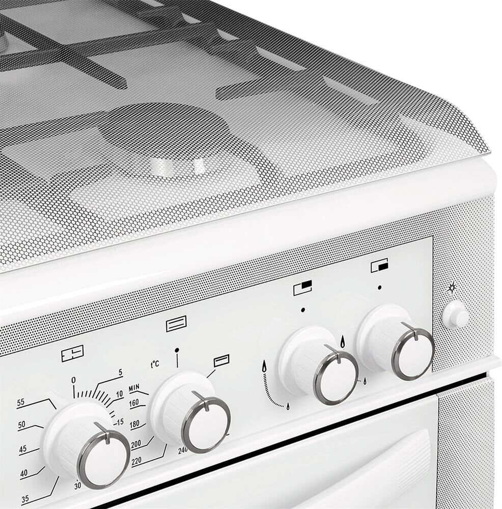 Габаритные размеры ШхГхВ: 60х60х85 см * Цвет: белый. Варочная поверхность: эмалированная. *Полезный объём духовки: 52 л * Вертел с электроприводом * Съемные проволочные направляющие духовки * Выдвижной ящик для посуды и принадлежностей * Таймер механический * Газ-контроль духовки * Терморегулятор (термостат) * Гриль * Чугунные решетки горелок стола * Ножки регулировочные * Электророзжиг горелок, кнопка розжига на панели * Подсветка духовки двойная * Электророзжиг духовки, кнопка розжига на панели *
