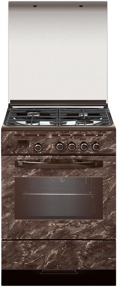 Габариты, ШхГхВ, см: 60x60x85; Цвет: с рисунком "мрамор", коричневый; Дизайн: мрамор; Ширина, см: 60; Фасад: закаленное стекло; Варочная поверхность: эмалированная; Решетки стола: чугунные; Крышка стола: стеклянная; Класс электробезопасности: I; Объем духовки, л: 52; Мощность горелки духовки, кВт: 3,1; Мощность гриль-горелки, кВт: 1,9; Таймер: сенсорный; Газ-контроль духовки; Газ-контроль горелок стола; Электророзжиг духовки: встроен в ручку; Электророзжиг горелок стола: встроен в ручки; Гриль: газовый; Вертел с электроприводом; Подсветка духовки; Направляющие духовки: съемные проволочные; Терморегулятор (термостат); Ящик для посуды и принадлежностей: выдвижной; Ножки регулировочные; Сетевой шнур и вилка: в наличии; Стекло дверцы духовки: двойное; Комплектность: жаровня, противень, решетка духовки; Комплект сменных сопел
