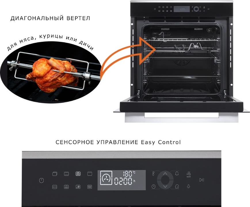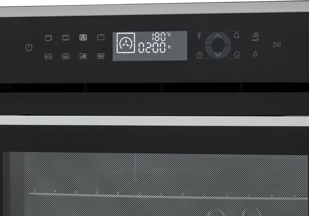 Черное стекло со вставками из нержавеющей стали 10 режимов нагрева 3 доп. функции: режим ECO, режим ферментации, подогрев тарелок Сенсорное управление Easy Control LCD-дисплей Функция памяти Цифровые часы с таймером автоматического отключения Система ве