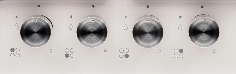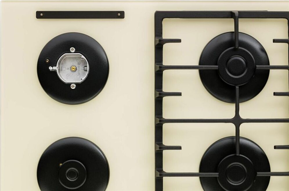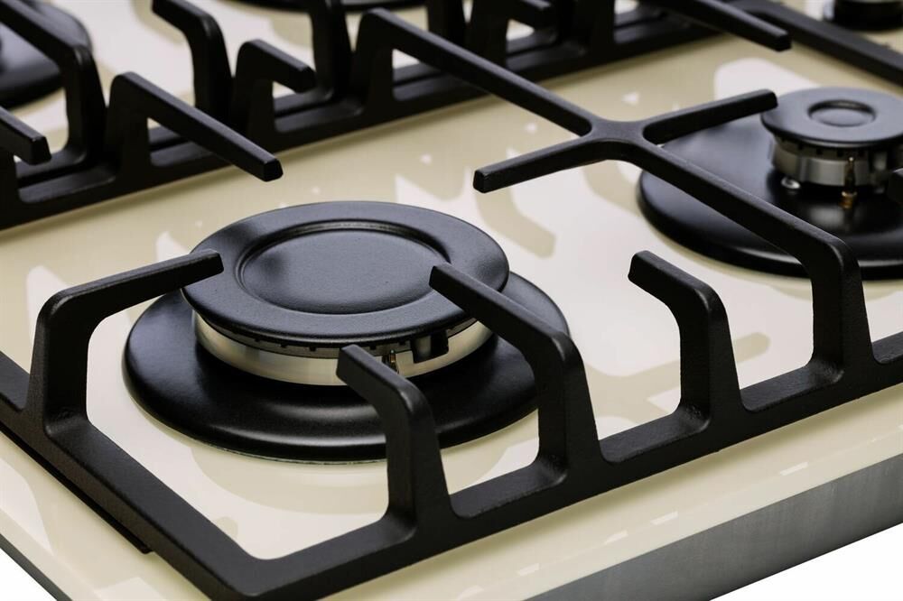 "• Управление с помощью поворотных переключателей • Кремовое закаленное стекло • Оригинальные конфорки SABAF • 1 мощная конфорка 2,6 кВт • 2 стандартные конфорки 1,75 кВт • 1 экономичная конфорка 1,0 кВт • Чугунные решетки • Система GasControl • Электр