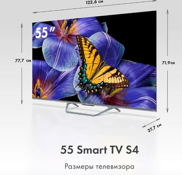 Диагональ: 55" (140 см) Соотношение сторон: 16:9 Разрешение: 3840х2160 Яркость: 320 кд/м2 Контрастность: 4000:1 Угол обзора: 178/178 ° Время отклика: 8 мс Разъемы (вход): HDMI 2.1 х 4, USB 2.0 х 2, антенный, композитный, CI+, аналоговый аудио, Ethernet Разъемы (выход): выход для наушников Изображение: Тип подсветки: HQLED Частота обновления: 60 Гц HDR-Dolby Vision Цифровое шумоподавление MEMC HDR 10 Upscaling 4K UHD Системы вещания: DVB-T2 DVB-C DVB-S2 Система аналогового ТВ: PAL/SECAM Звук: Тип колонок: стерео Суммарная выходная мощность аудио: 30 Вт Dolby Atmos Эквалайзер DBX-TV Объемный звук Dolby Digital Decoding SMART TV : Операционная система: Android TV 11.0 Сетевые функции: Wi-Fi, Bluetooth 5.1 Версия Wi-Fi: 5 Гц Поддержка YouTube Поддержка Google Play Store Голосовой поиск Особенности: Энергопотребление: 165 Вт Цвет лицевой панели: серый Голосовое управление без пульта Far Field Таймер Вкл/Выкл Воспроизведение с USB носителя Родительский контроль Запись на USB HDMI CEC