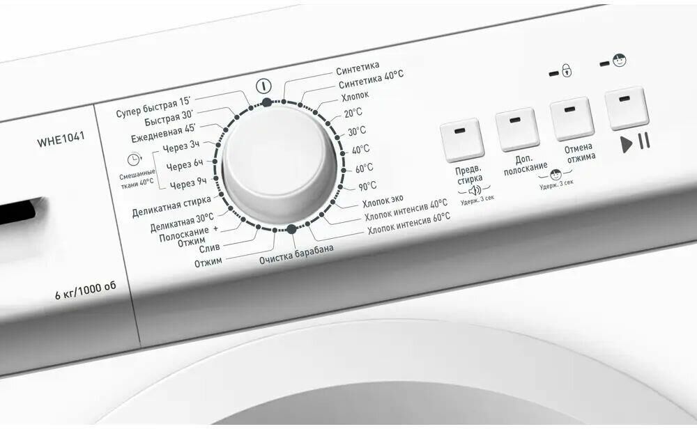 Тип загрузки: фронтальная; Максимальная загрузка белья: 6 кг; Инверторный двигатель: нет; Максимальная скорость отжима: 1000 об/мин; Тип управления: электронное; Сушка: нет; Количество программ стирки: 23; Программы: хлопок, хлопок ECO, синтетика, деликатная стирка, ежедневная стирка, экспресс стирка, быстрая стирка