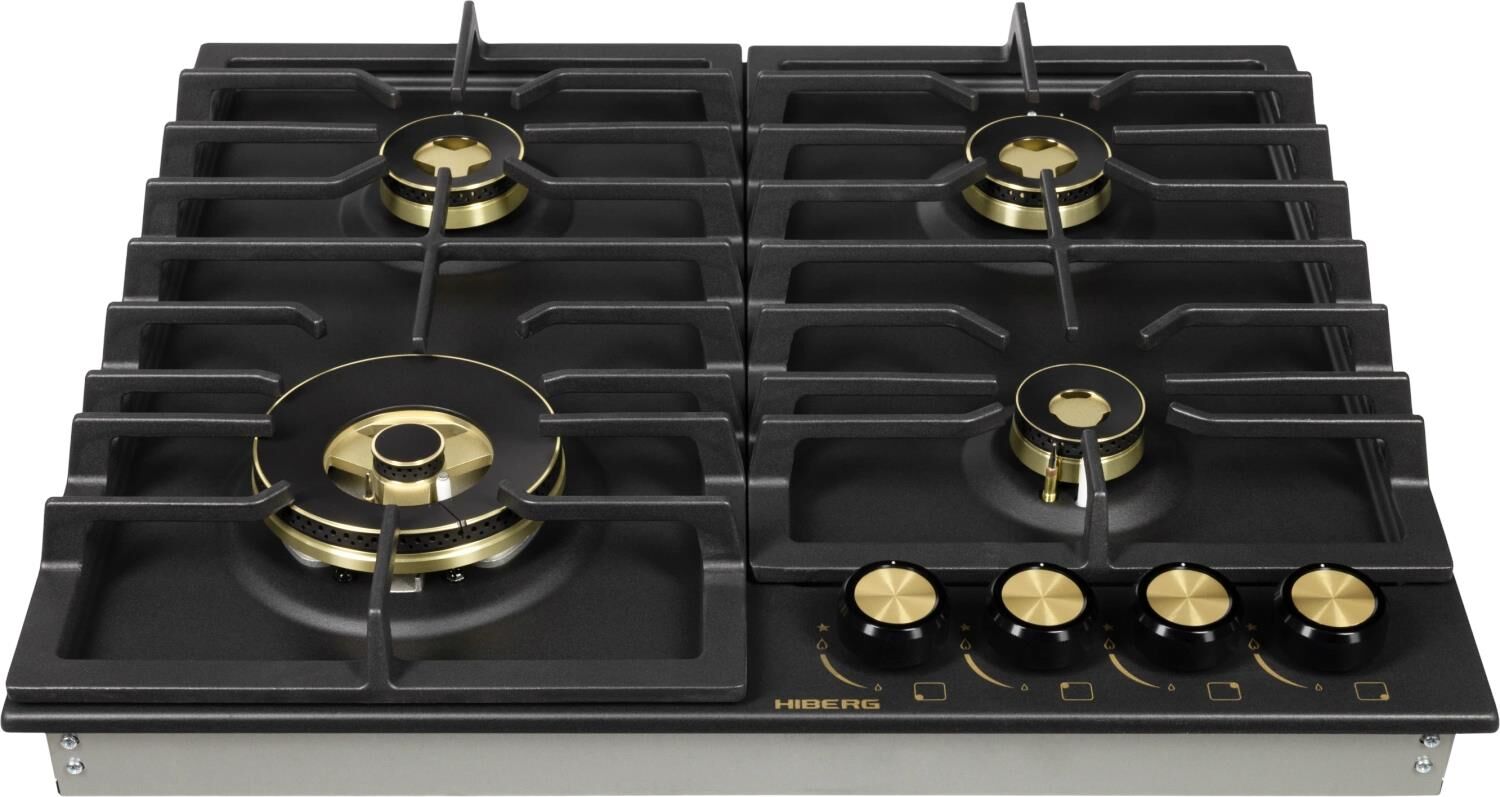Латунные энергоэффективные конфорки; электроподжиг; ГАЗ-контроль, решетка: чугунная; WOK конфорка; цвет поверхности: матовый черный; цвет ручек: черный+бронза; Ширина (см) 58,4; Глубина (см) 51;