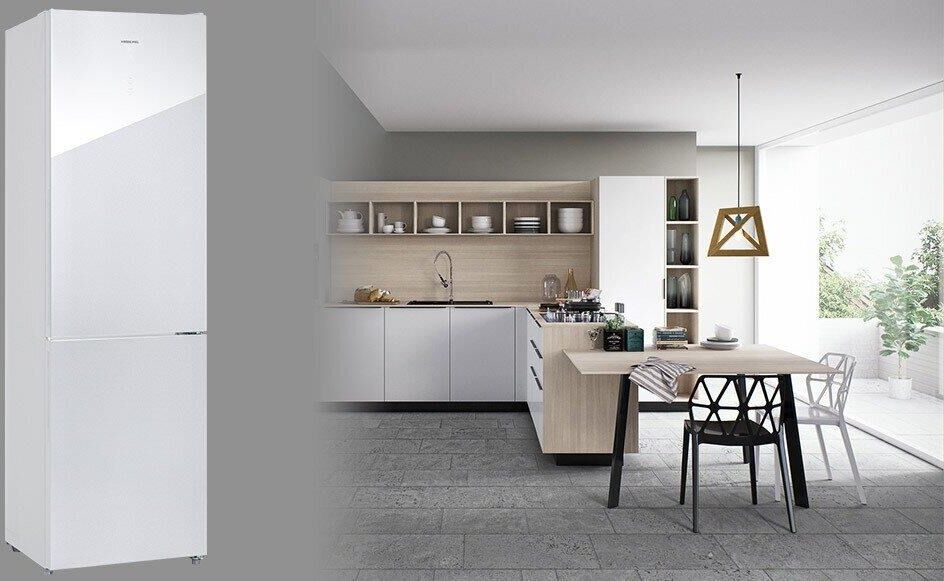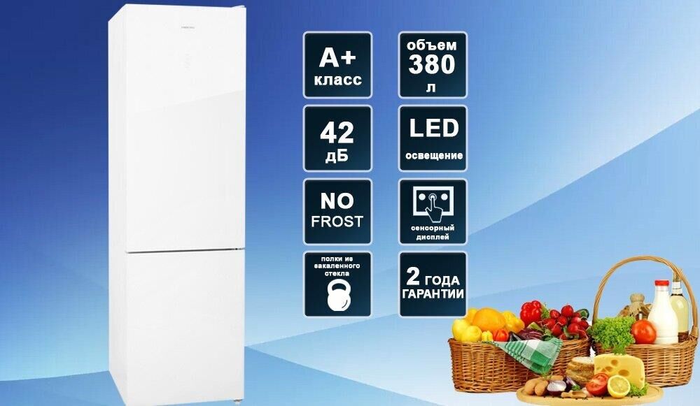 INVERTER NoFrost; COMBI; ШхГхВ: 595х655х2000мм; V=380/351 л (257л/94л); Класс A++; 4 полки; Фреон R600a; Полка для вина; 2 выдвижных ящика. Отделение с рег. ур. влажности;. кл.к. SN-T; 42 дБ; Цвет: белое мерцающее стекло