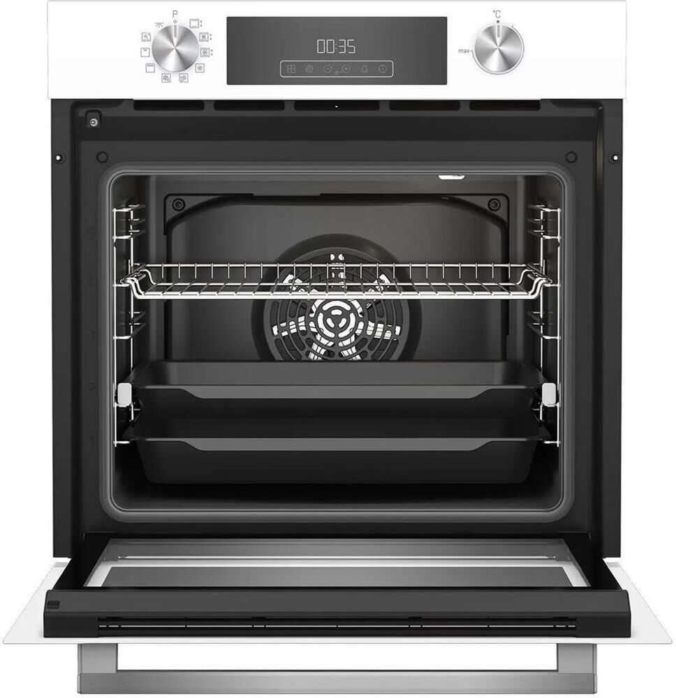 Электрический духовой шкаф; 9 программ; дисплей; поворотные переключатели; система очистки паром; телескопические направляющие на одном уровне; объем — 72л.; 2 стекла дверцы; 1 решетка; 1 противень; 1 глубокий противень; цвет — белый