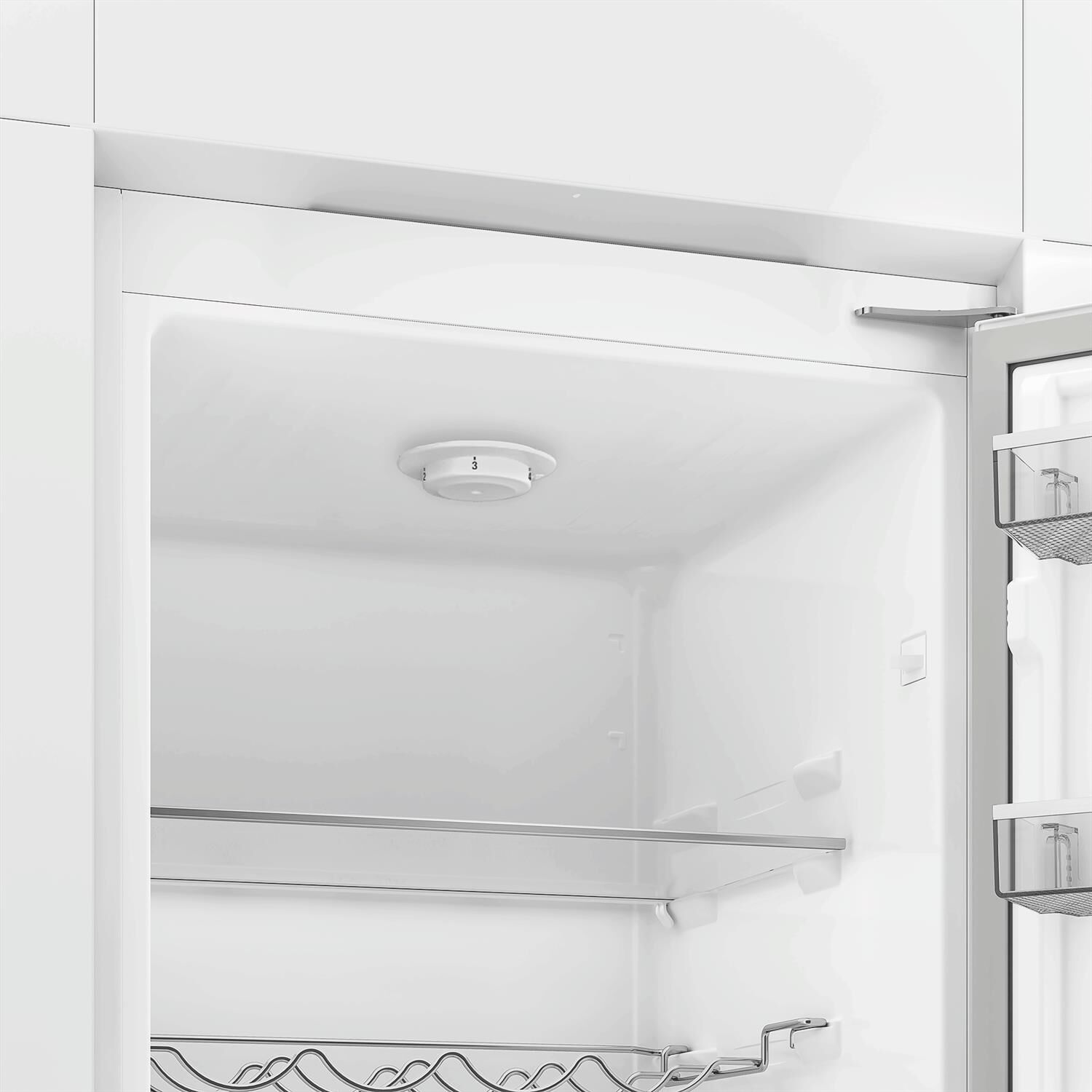 Встраиваемый однодверный холодильник высотой 1,77м; статическая система охлаждения; LED освещение; механическое управление; перенавешиваемая дверь; общий полезный объем — 309л; уровень шума — 37 дБ; класс энергопотребления — А+; цвет — белый