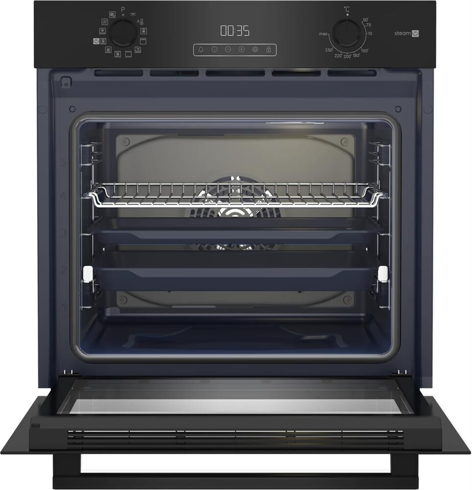 Электрический духовой шкаф; 12 режимов; AirFry; Приготовление с паром; дисплей; панель управления из стекла; утапливаемые поворотные переключатели; каталитическая очистка задней стенки; плавное закрытие дверцы; телескопические направляющие на одном уровне; объем — 72л.; 3 стекла дверцы; 1 противень; 1 глубокий противень; 1 аксессуар для AirFry; цвет — черный