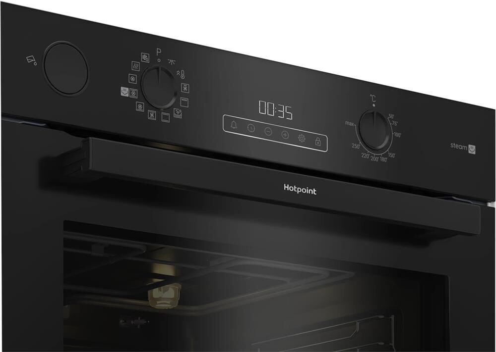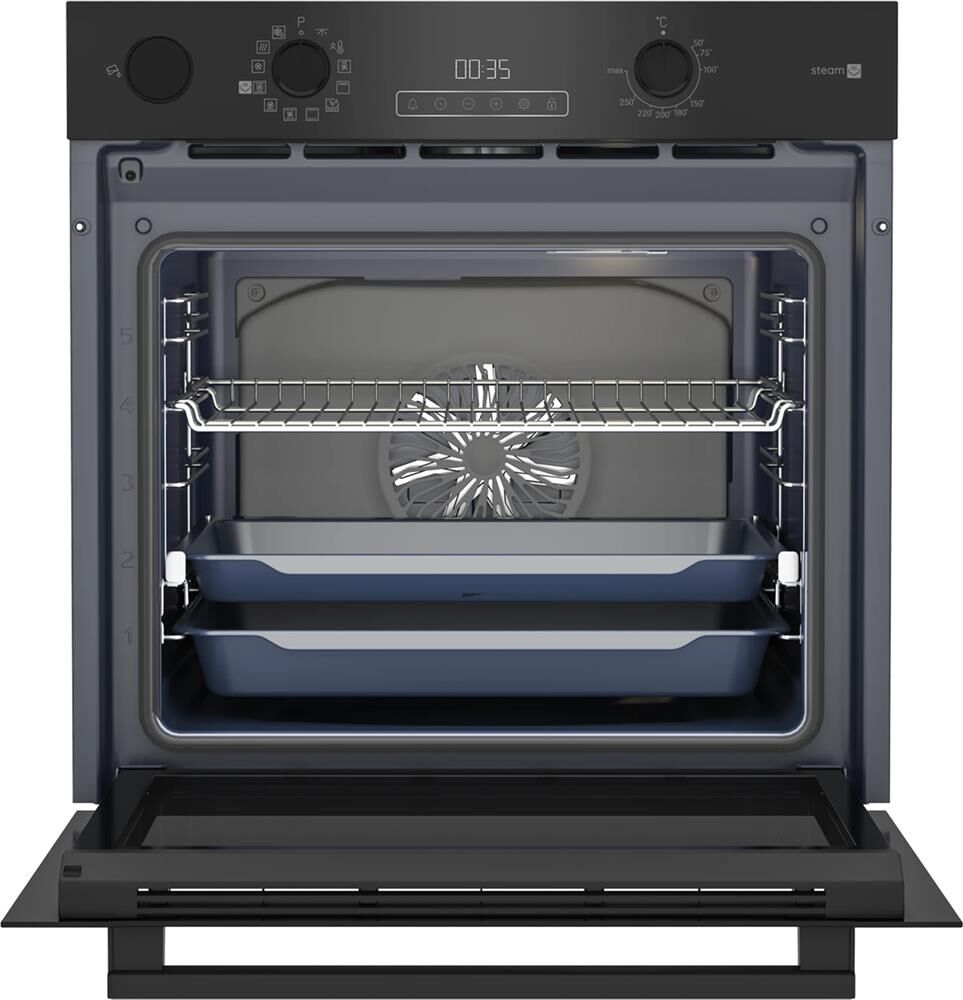Электрический духовой шкаф; 12 программ; резервуар для приготовления с паром; дисплей; утапливаемые поворотные переключатели; панель управления из стекла; плавное закрытие и открытие дверцы; дверца духовки с затемнением; каталитическая очистка задней стенки; телескопические направляющие на двух уровнях; объем — 72л.; 3 стекла дверцы; 1 решетка; 1 противень; 1 глубокий противень; цвет — черный