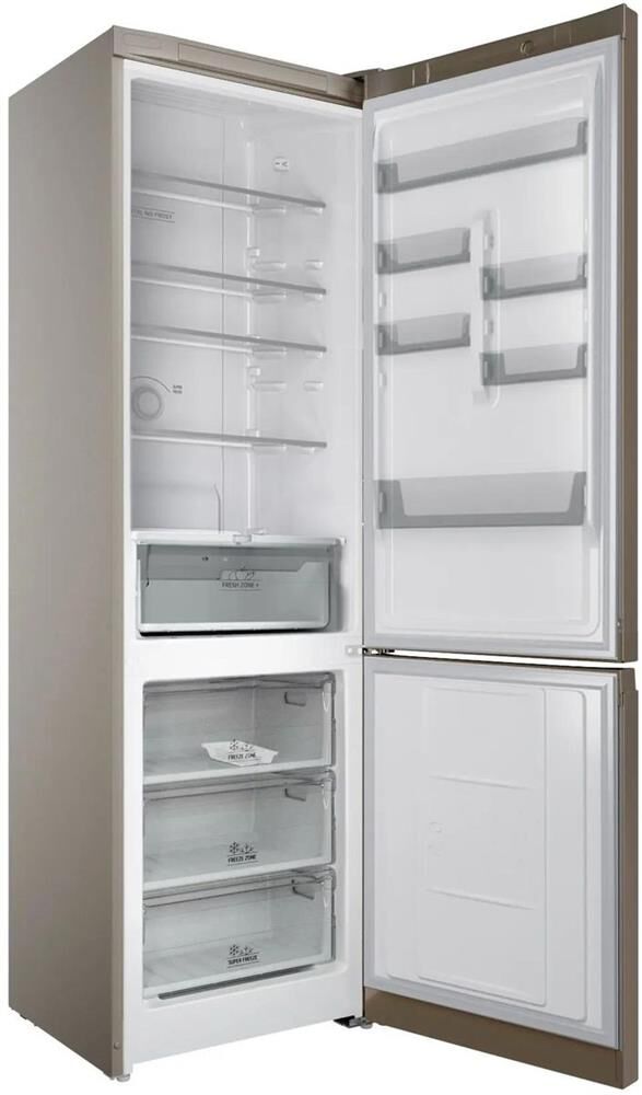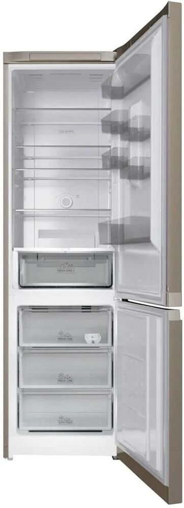 Размеры (ВхШхГ), см: 200x60x66. Общий объем брутто, л 357. Общий полезный объем 323л (ХОЛОД.ОТД: 240 + МОРОЗ.ОТД: 83).Двухкамерный холодильник, Total No Frost, морозильная камера расположена снизу. Общее количество полок из закаленного стекла — 4. Общее количество ящиков в морозльной камере — 3. Подставка для яиц — 1 шт. Тип подставки для яиц 1х10.Охлаждающая система No Frost Время сохранения температуры без электричества, ч 14 Мощность замораживания, кг/24 ч 9 Форма для кубиков льда Да Полки из закаленного стекла Да Дополнительная информация Антибактериальный уплотнитель дверей Нет Перенавешиваемые двери Да Уровень шума, дБ 40 Тип ручки интегрированная класс А+, цвет бронзовый