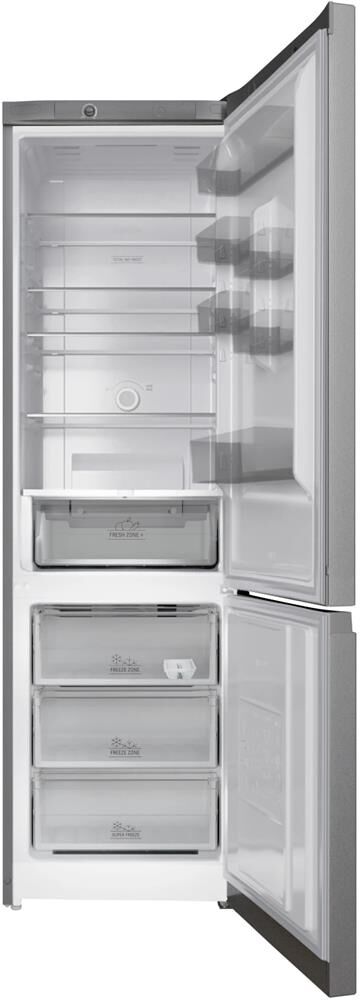 Размеры (ВхШхГ), см: 200x60x66. Общий объем брутто, л 357. Общий полезный объем 323л (ХОЛОД.ОТД: 240 + МОРОЗ.ОТД: 83).Двухкамерный холодильник, Total No Frost, морозильная камера расположена снизу. Общее количество полок из закаленного стекла — 4. Общее количество ящиков в морозльной камере — 3. Подставка для яиц — 1 шт. Тип подставки для яиц 1х10.Охлаждающая система No Frost Время сохранения температуры без электричества, ч 14 Мощность замораживания, кг/24 ч 9 Форма для кубиков льда Да Полки из закаленного стекла Да Дополнительная информация Антибактериальный уплотнитель дверей Нет Перенавешиваемые двери Да Уровень шума, дБ 40 Тип ручки интегрированная класс А+, цвет серебристый