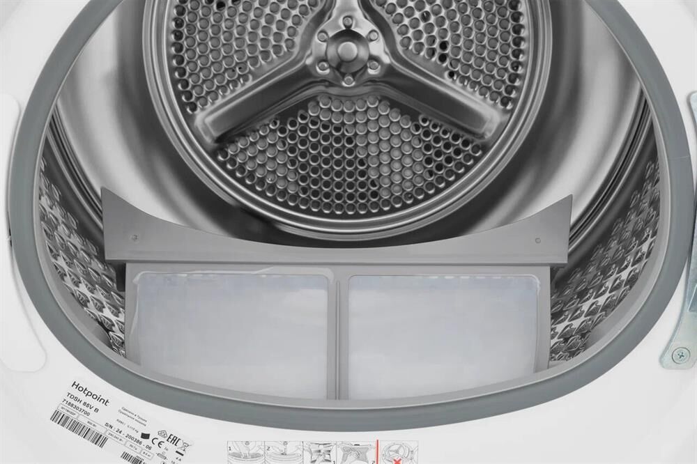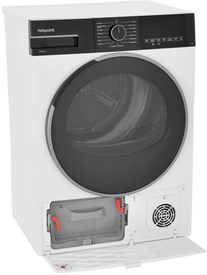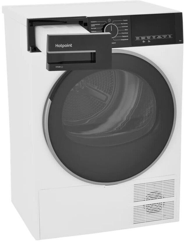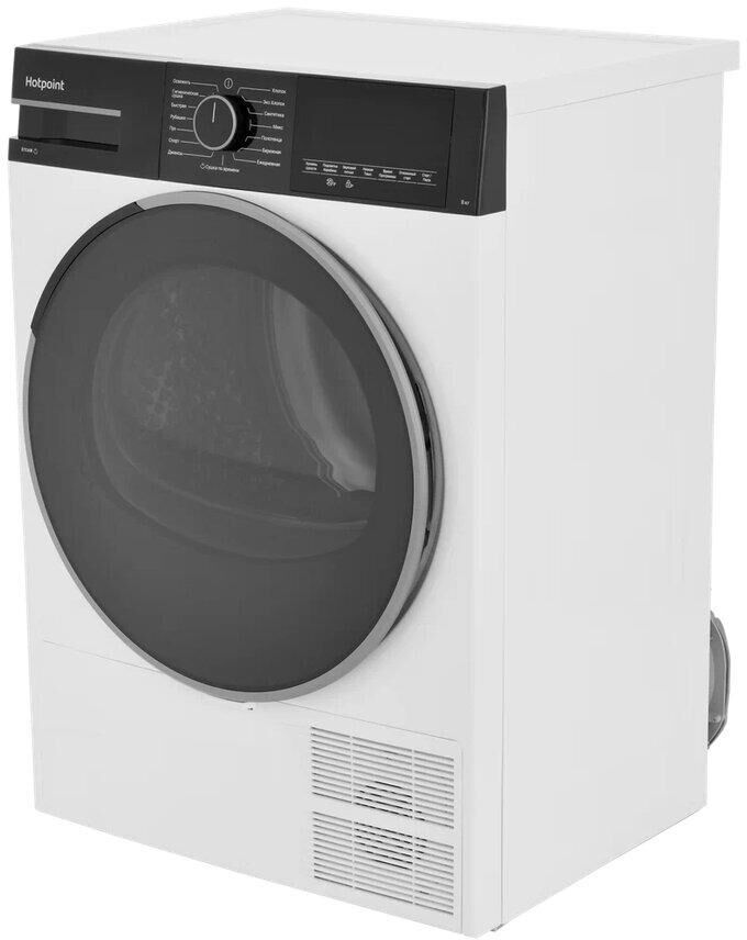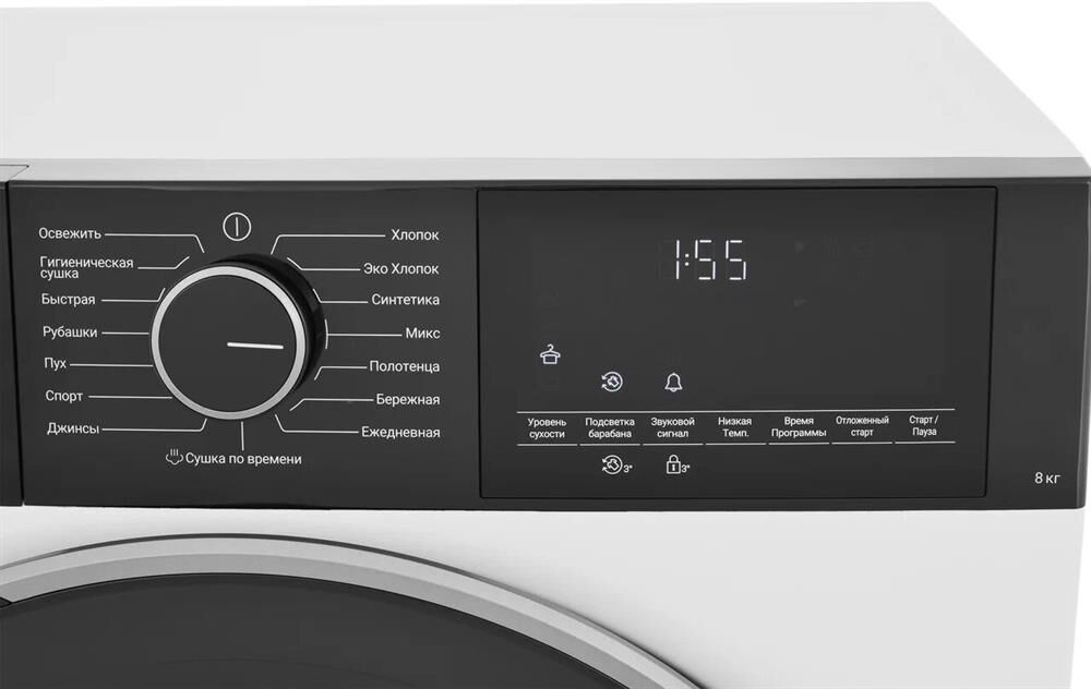 (ВхШхГ)84.6 х59.7х54,3см.Максимальная загрузка: 8 кг.Вид сушки: конденсационный с тепловым насосом Тип двигателя: коллекторный.Тип управления: электромеханическое.Переключатели: поворотные, сенсорные. Размещение панели управления: под наклоном. Тип сушки: по степени влажности, по таймеру Количество программ: 15.Сушка паром.Защита от сминания.Цифровой дисплей.Таймер отсрочки. — Максимальное время отсрочки: 24 ч.Датчик влажности. Защита от детей. Ворсовый фильтр. Класс энергопотребления: A++.