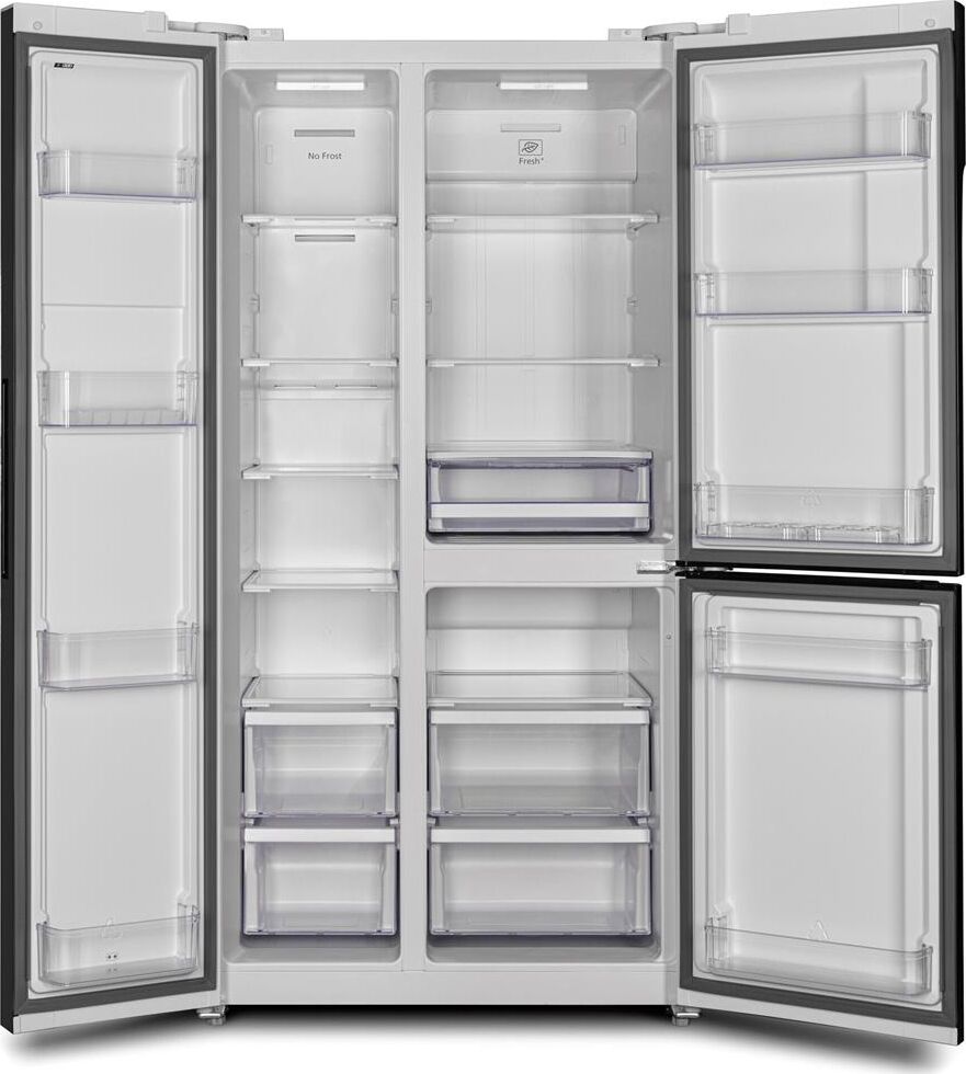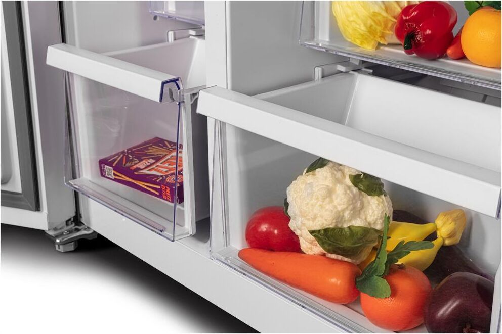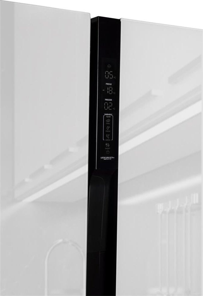 Холодильник Side-by-Side. Полезный объём: 552 л. Полезный объем холодильной камеры: 329 л. Полезный объем морозильной камеры: 223л. Универсальное отделение (от -4 до 8) Система размораживания Nofrost. Тип управления: сенсорное управление (внешний дисплей). Уровень шума 43dB(A). Класс энергопотребления: А+. Цвет: белое стекло. Инверторный компрессор. Габаритные размеры в*ш*г, см: 183.0*91.1*65.6. Вес нетто/брутто: 86 / 96 кг. Инверторный компрессор. Гарантия 2 года