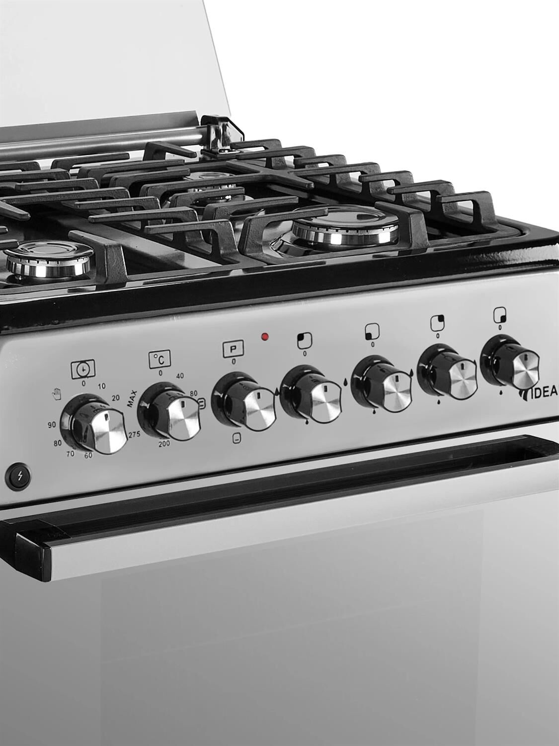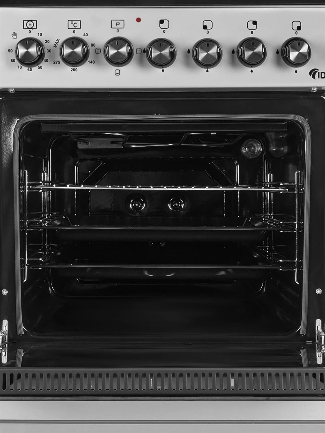 Габариты плиты (ШхВхГ), см: 60х85х60; Объем духовки: 65 литров; Газовые конфорки: 4 шт; Стеклянная крышка рабочего стола; Электроподжиг рабочего стола; Духовка -электро; Чугунная решетка рабочего стола; 2-слойное остекление дверцы духовки; Подсветка духовки; Таймер и термостат духовки; Никелированная решетка духовки; Эмалированный противень — 2 штуки