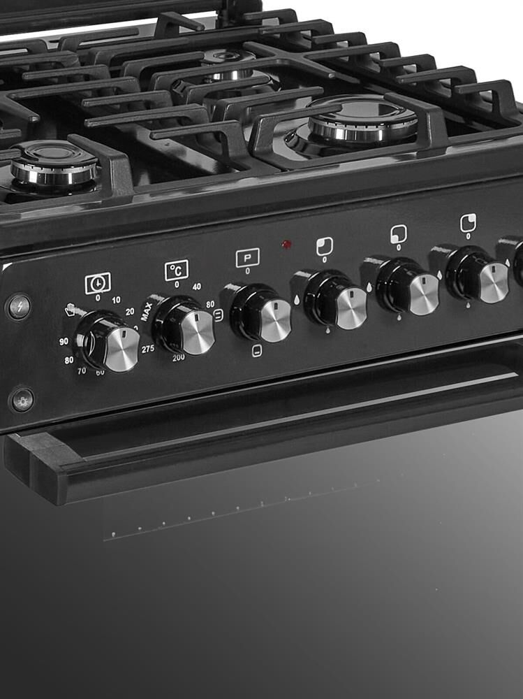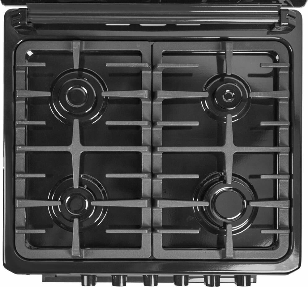 Габариты плиты (ШхВхГ), см: 60х85х60; Объем духовки: 65 л; Газовые конфорки: 4 шт; ГК, Стеклянная крышка рабочего стола; Электроподжиг рабочего стола; Духовка: электрическая; Чугунная решетка рабочего стола; 2-слойное остекление дверцы духовки; Подсветка духовки; Таймер и термостат духовки; Никелированная решетка духовки; Эмалированный противень — 2 штуки
