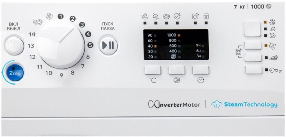 Загрузка: 7 кг, скорость отжима: 1000 об/мин, панель управления: LED+ дисплей, тип мотора: инверторный, сегмент: узкая стиральная машина, уровень шума при стирке/отжиме: 58/80 Дба, потребление воды за цикл: 52 л, потребление электроэнергии за цикл: 1,05 кВт/ч, кКол-во программ: 12, в том числе Хлопок, Синтетика, Цветные ткани, Деликатные ткани, Смешанное, Быстрая 30’, удаление запахов, функция: Push&Go Steam, функция: Отложенный запуск, функция: Выбор температуры, функция: Пятна, функция: Выбор скорости отжима, индикатор заблокированного люка, индикация стирки / полоскания / отжима / слива, защита от детей