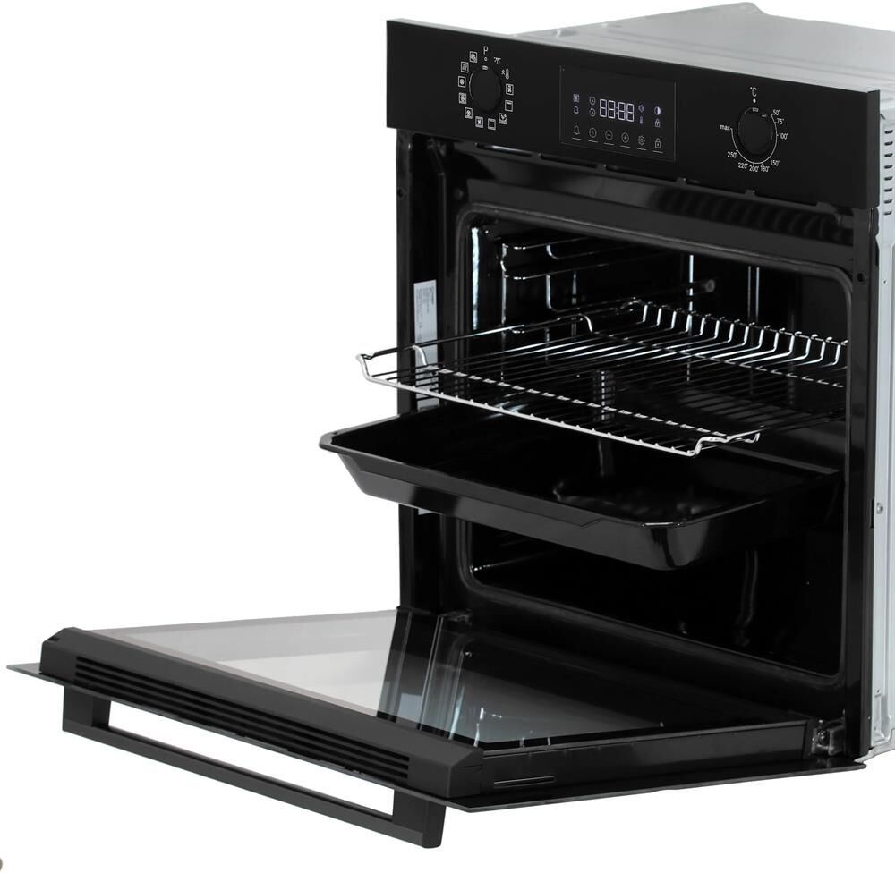 Электрический духовой шкаф; 12 режимов: внутренняя подсветка, разморозка, верхний и нижний нагрев, нижний нагрев, вентиляционный нагрев, конвекция, пицца, 3D приготовление, гриль, малый гриль с вентилятором, быстрый разогрев (Booster), поддержание тепла; LED дисплей; утапливаемые переключатели; каталитическая очистка задней стенки; боковые металлические направляющие; объем — 72л; 1 решетка; 1 глубокий противень; Цвет: Черный; Внутренняя подсветка; Таймер; Максимальная потребляемая мощность, Вт 3300.