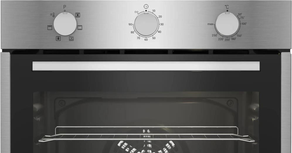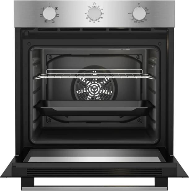 Электрический духовой шкаф; 6 программ; дисплей; поворотные переключатели; таймер; рельефные направляющие; объем — 72л.; 2 стекла дверцы; 1 решетка; 1 противень; цвет — нержавеющая сталь