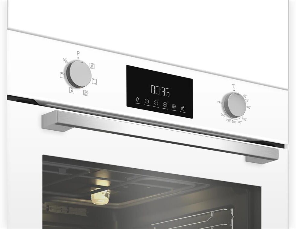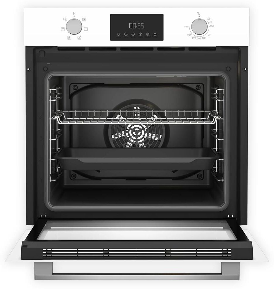 Размеры без упаковки (ВхШхГ), см — 59,5×59,4×56,7. Электрический духовой шкаф; 6 программ; дисплей; поворотные переключатели; система очистки паром; металлические направляющие; объем — 72л.; 2 стекла дверцы; 1 решетка; 1 противень; цвет — белый