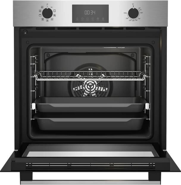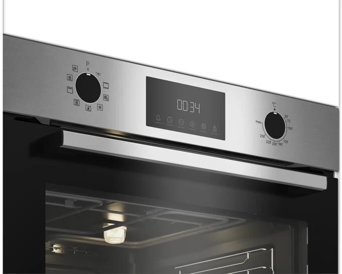 Электрический духовой шкаф; 8 программ; дисплей; утапливаемые поворотные переключатели; система очистки паром; телескопические направляющие на одном уровне; объем — 72л.; 3 стекла дверцы; 1 решетка; 1 противень; 1 глубокий противень; цвет — нержавеющая сталь