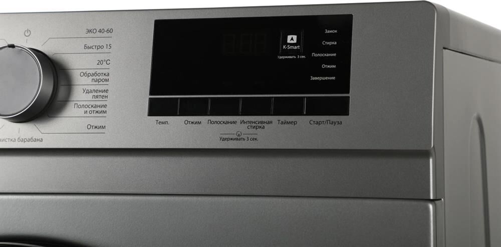 загрузка белья —6 кг количество программ — 15 обороты отжима — 1000 об/мин Обработка паром — да Программа K-Smart — да класс энергоэффективности — А+ масса нетто/брутто — 53/56 кг габариты в упаковке (ШхГхВ) — 650х520х870 мм габариты без упаковки (ШхГхВ) — 600х450х840 мм