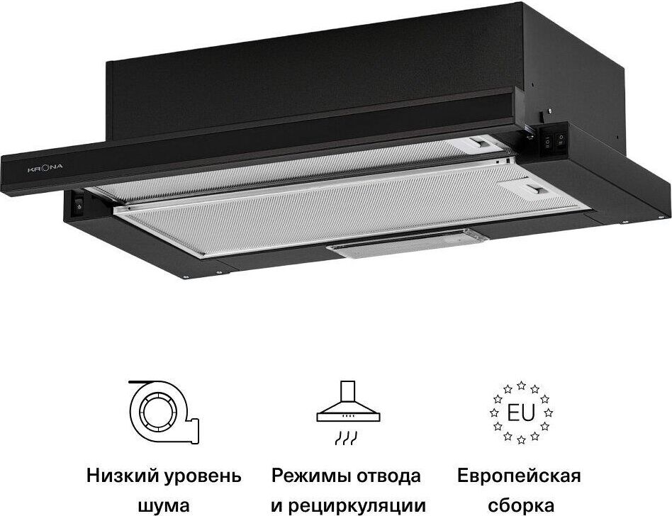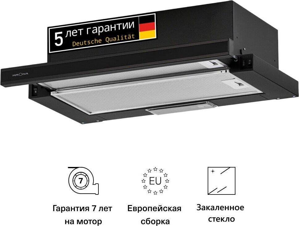 (ШхВхГ)60х17,7х30,5-42,5см.Цвет черный.Рекомендованная площадь кухни 16.Вес, кг 6.0.Диаметр воздуховода (мм) 120.Высота установки над электрическими варочными поверхностями, см 50.Высота установки над газовыми варочными поверхностями, см 65.Производительность (м3/ч) max 820.Производительность свободный выход (куб.м/ч) 1066.Количество скоростей 3.Мощность мотора: шт. х Вт 2 х 90.Уровень шума, дБ (min — max) 46-58.Тип подсветки LED.Освещение: шт.х Вт 1 х 3.Количество жироулавливающих фильтров 2.Антивозвратный клапан. 5 лет гарантии; 7 лет гарантии на моторы.