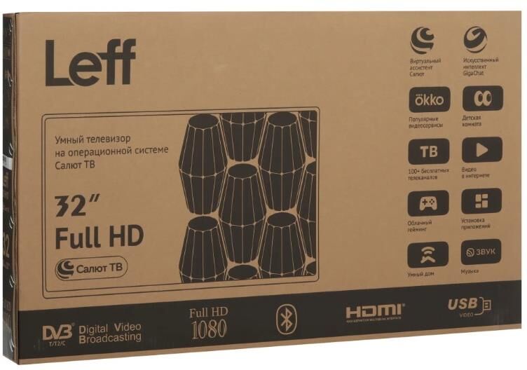 Диагональ 32" Формат экрана 16:9 Разрешение 1920×1080 Частота обновления 60 Гц Операционная система/платформа Салют ТВ Функции Экранное меню на русском да Функция TimeShift да Встроенная память 8 Гб Прием сигнала Поддержка DVB-T да Поддержка DVB-T2 да Поддержка DVB-C да Звук Мощность звука 14 Вт Декодер Dolby Digital да Интерфейсы Входы Wi-Fi, Bluetooth, 3 x HDMI, RJ-45, USB, аудио Версия HDMI 2.0 Разъем для наушников да Разъемы на передней/боковой панели HDMI Дополнительно Крепление на стену (VESA) 200×100 Цвет чёрный Размеры (ШхВхГ) 716 x 472 x 186 мм