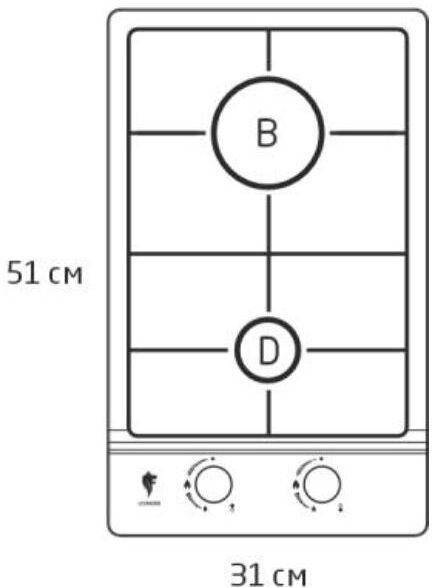 2 горелки Мощность горелок 3,0/1,0 кВт Материал панели сталь Материал решетки эмаль Размер 31*51 см Электроподжиг Мощность электроподжига 1,5 Вт Фиксированное положение "Минимальное пламя" Набор форсунок для баллонного газа Тип газа: природный (метан), сжиженный (пропан-бутан) Давление газа: G20 2000 Па (20 мбар) Напряжение 220-240В,50-60Гц Гарантия 2 года
