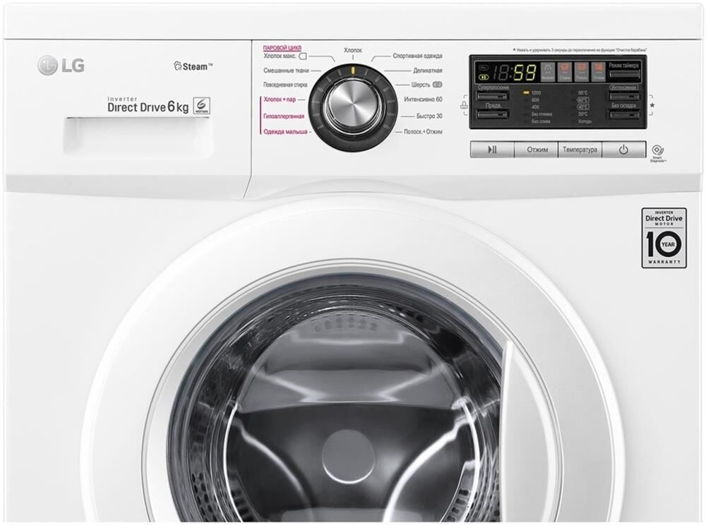 60x44x85 см * Цвет белый * загрузка: 6 кг * отжим при 1200 об/мин * Количество программ 13 * класс энергопотребления: A * Класс эффективности стирки А * электронное управление * Дисплей * Прямой привод * Инверторный двигатель * Контроль дисбаланса * подача пара