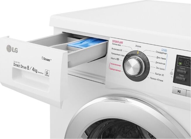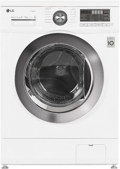 Габариты (ШхГхВ), см: 60x55x85; Максимальная загрузка при стирке, кг: 8; Максимальная загрузка при сушке, кг: 4; Максимальная скорость отжима (об/мин) 1400, Кол-во программ 10, Функция пара SpaSteam, Функция сушки, Мобильная диагностика Smart Diagnosis, 6 движений заботы, Инверторный мотор с прямым приводом, Блокировка от детей, Низкий уровень шума и вибрации, Система пеноподавления, Цвет дверцы: Хром; Цвет: Белый; Инверторный мотор с прямым приводом; Автоперезапуск; Технология "6 движений заботы"; Автовзвешивание; Пузырьковая поверхность барабана; Регулирующиеся опоры, мм: 10