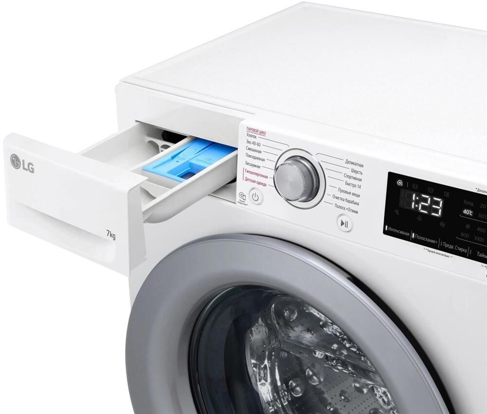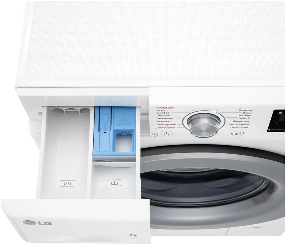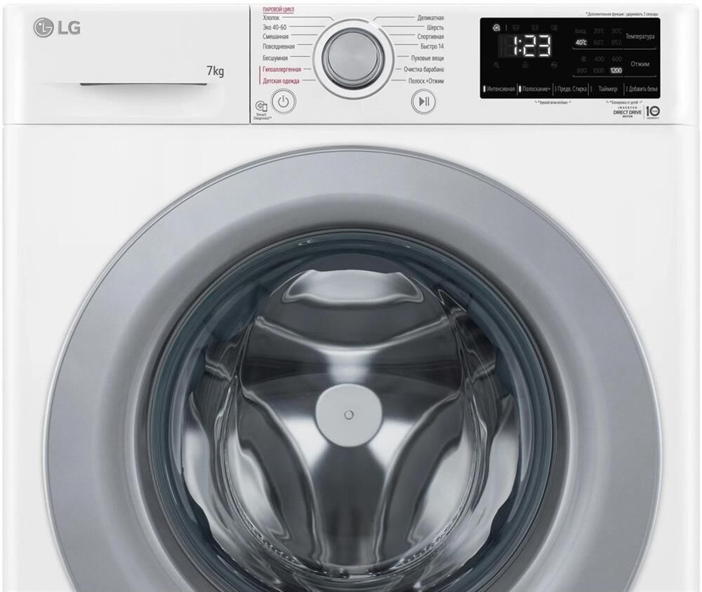 Габариты (ШxВxГ): 600 x 850 x 475. Инверторный мотор с прямым приводом Inverter Direct Drive. Загрузка: 7 кг. Цвет корпуса: Белый. Цвет панели: Белый. Цвет двери: Серебристый. Максимальная скорость отжима: 1200. Интеллектуальная система AI DD. Функция пара Steam. Функция очистки барабана.