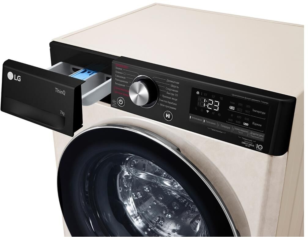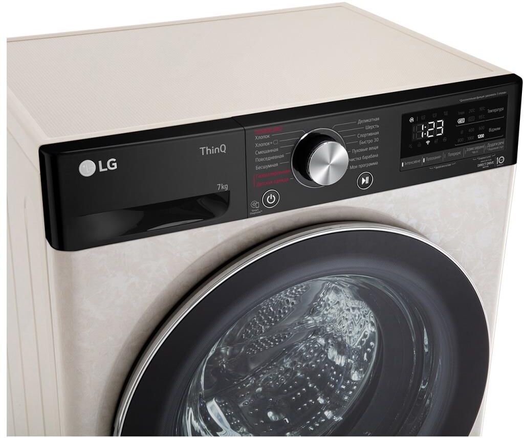 ШхГхВ: 60х45х85 см * Цвет бежевый * дозагрузка белья через основной люк * загрузка: 7 кг * Прямой привод * Инверторный двигатель * отжим при 1200 об/мин * Количество программ 14 * класс энергопотребления: A * Управление со смартфона * электронное управление * Контроль дисбаланса * защита от протечек * защита от детей * Дополнительная информация возможность управления через приложение SmartThinQ; технология LG Steam™; функция очистки барабана; Wi-Fi *