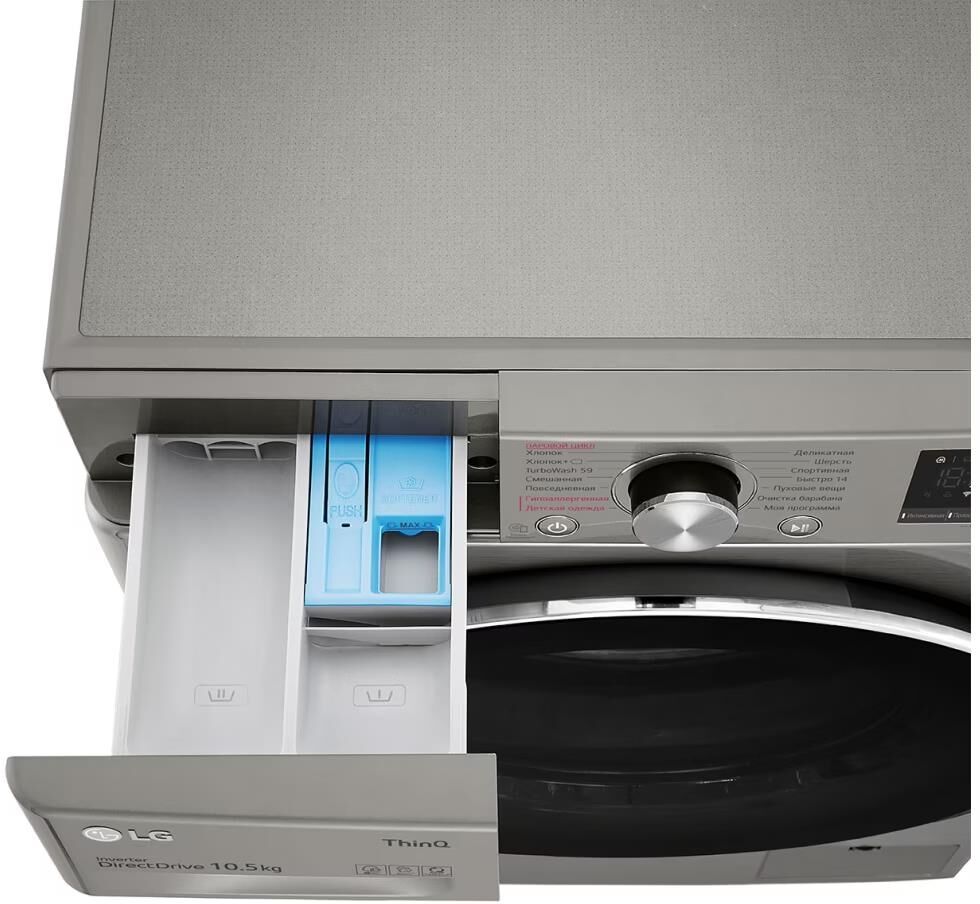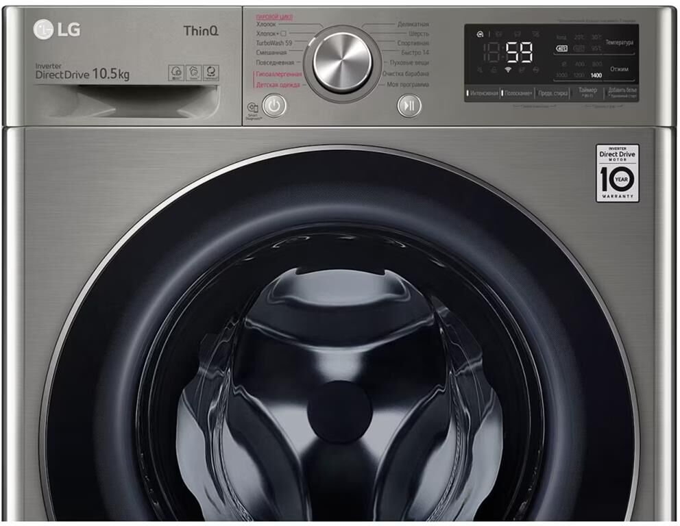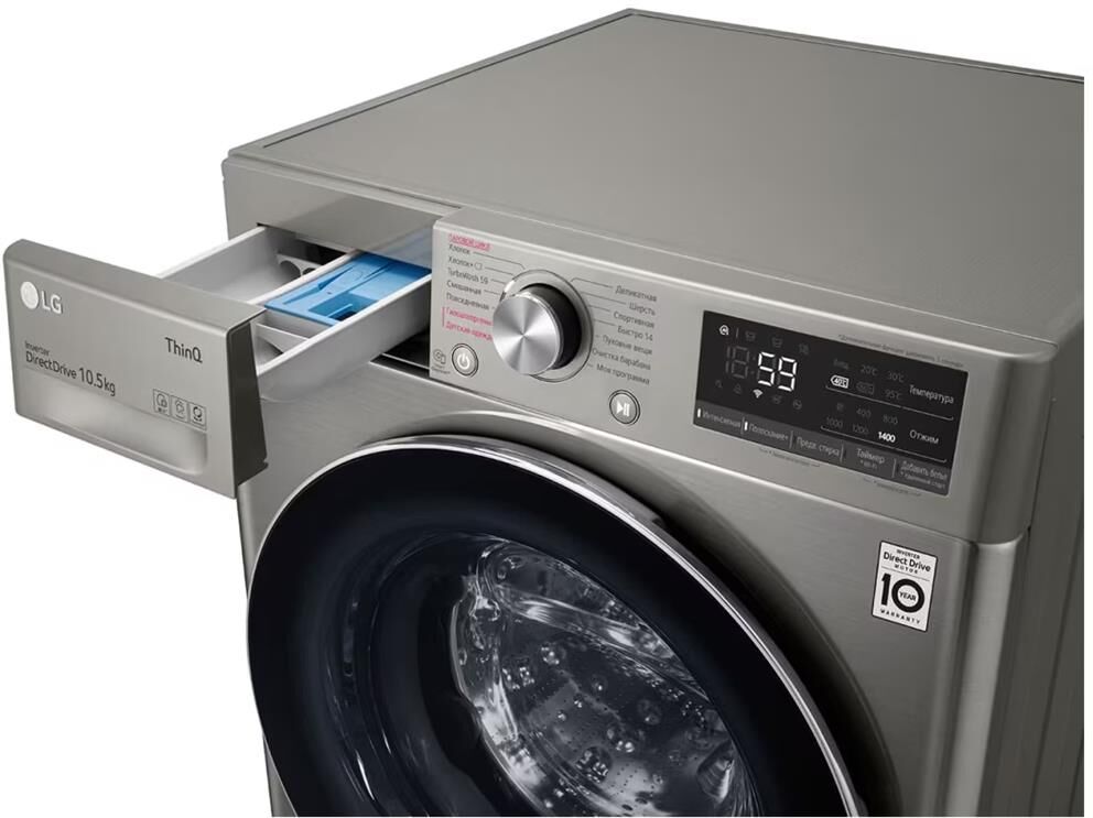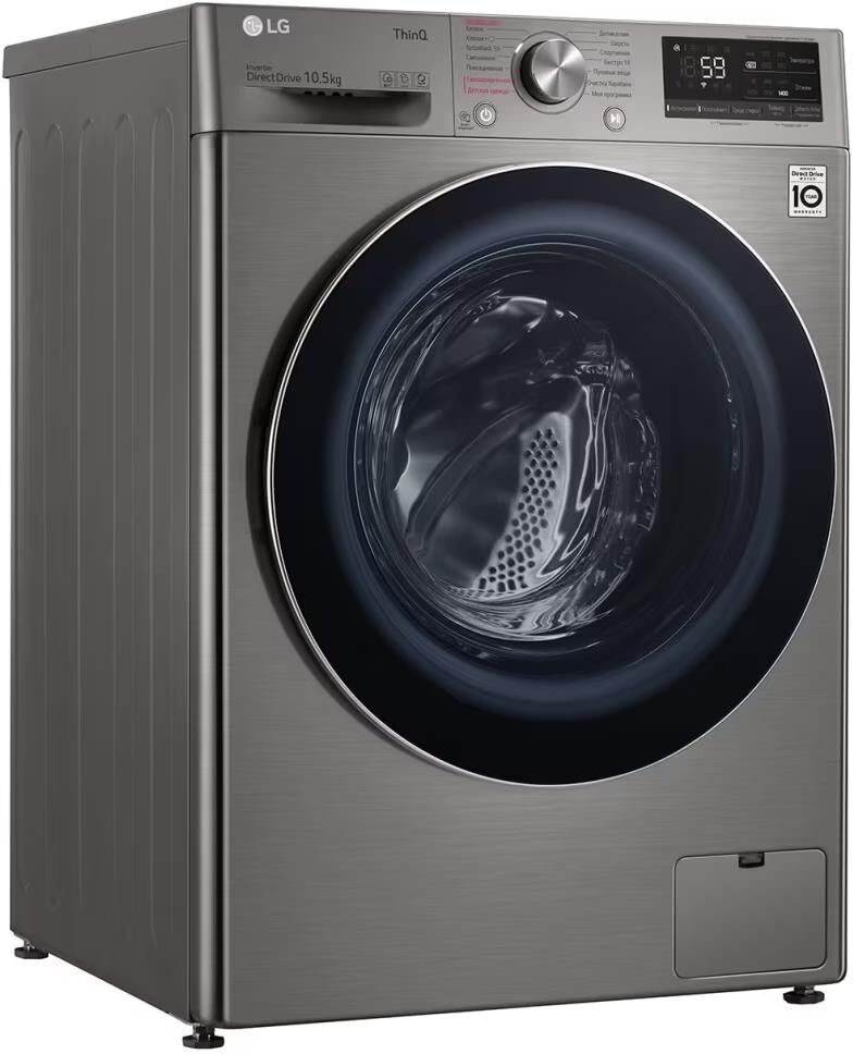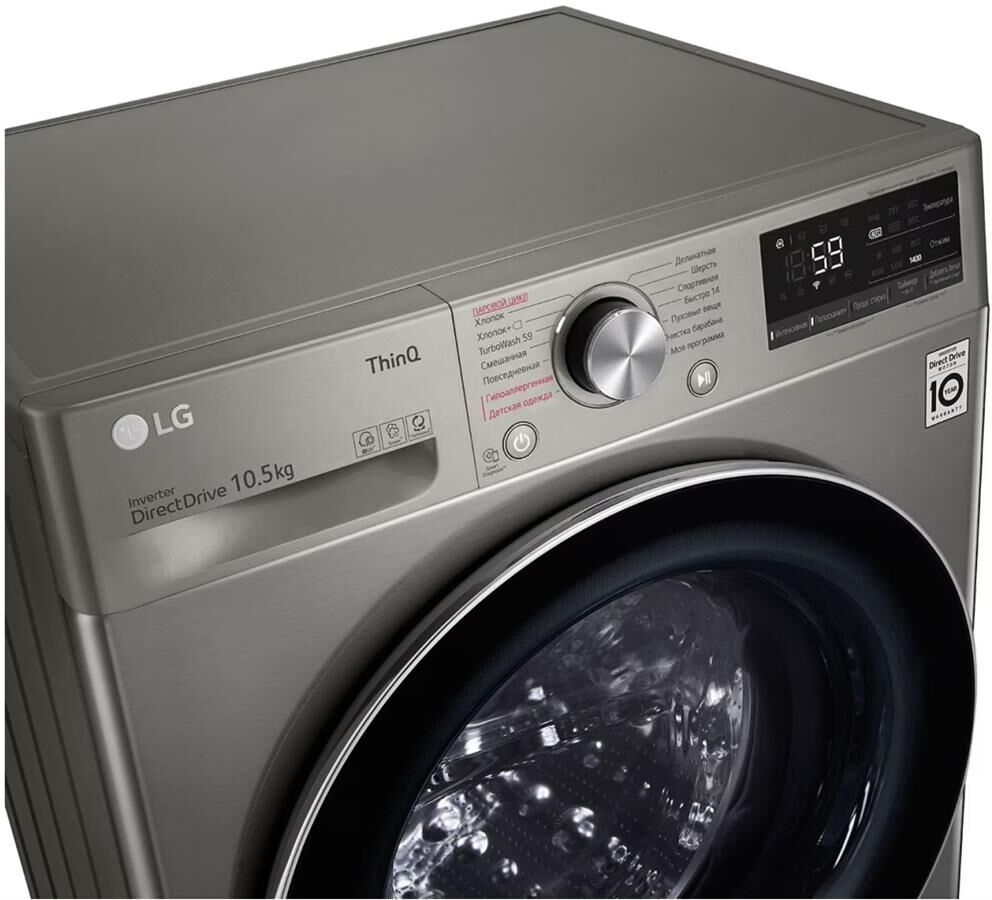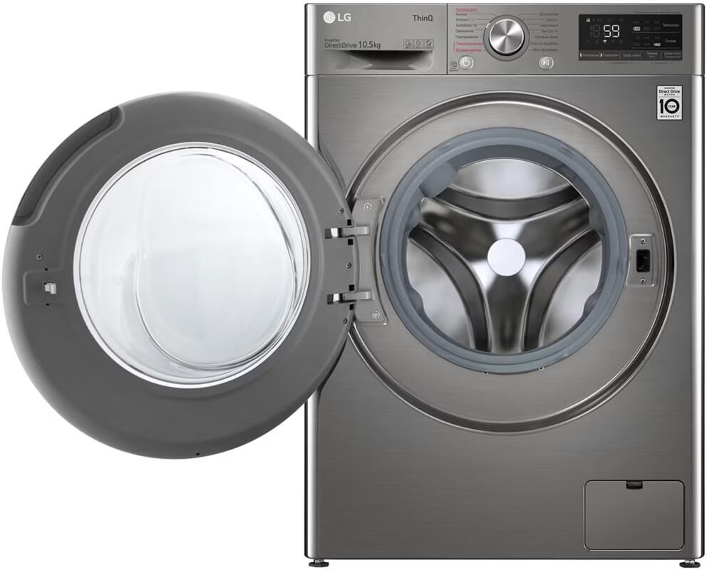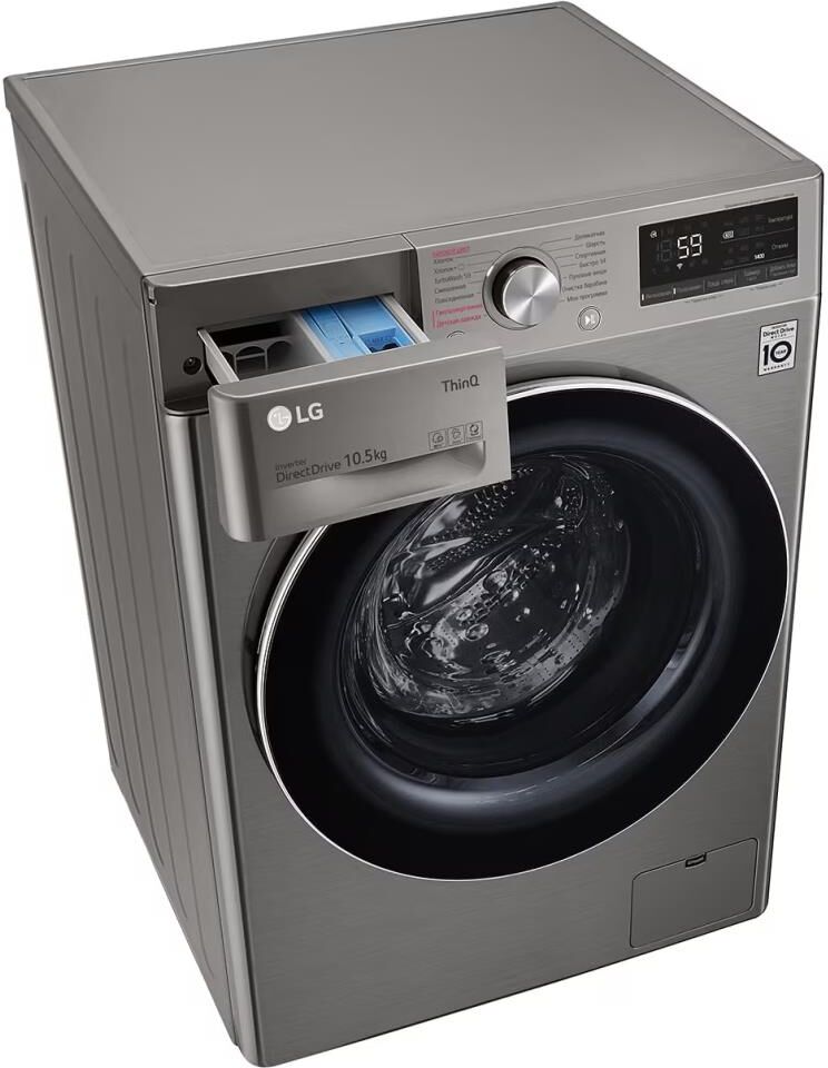 Стандартная стиральная машина с технологией AI DD, 10,5кг. Цвет серебристый. Габариты Ш/В/Г 600/850/565 мм. Вес 66 кг. Управление электронное. Максимальная скорость отжима 1400 об/мин. Тип барабана пузырьковый. Диаметр загрузочного люка 30см. Детектор загрузки. Автобалансировка. Автоперезапуск. Инверторный мотор с прямым приводом. Мобильная диагностика Smart Diagnosis. Возможность управления через приложение LG ThinQ. Функция пара Steam. Wi-Fi. Количество программ 14/7. Класс стирки A. Максимальный уровень шума при стирке 71дБ. Расход воды 53л. Дисплей LED. Система пеноподавления.