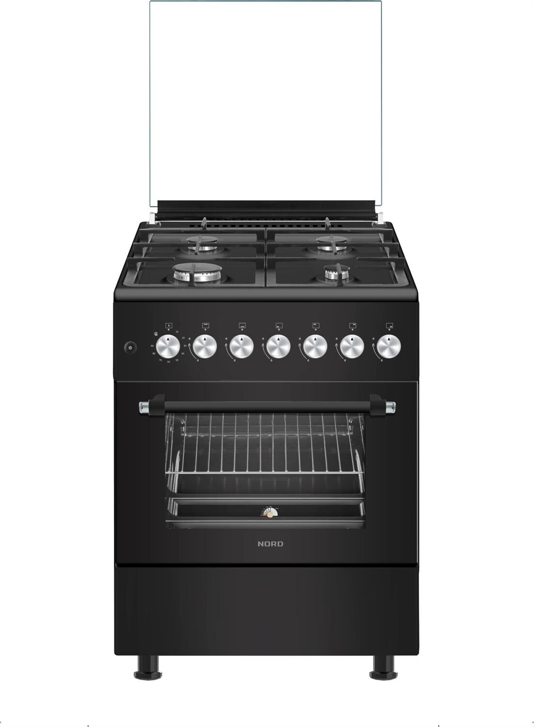 ШхГхВ: 60х60х88,5 см; 4 газовые конфорки; автоподжиг; решетка: чугунная; газовая духовка: 63 л; полный газ-контроль; подсветка; гриль; отделение для хранения посуды; таймер механический; цвет: черный матовый