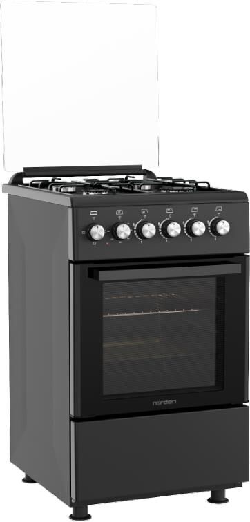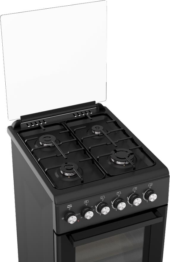 Плита отдельностоящая газовая с электрической духовкой 50х60 см, съемное внутреннее стекло (Cood Door), 4 конфорки с газ контролем , эмалированная решетка, подсветка духовки, верхний, нижний тэн Стеклянная верхняя крышка, электроподжиг, 1 противень, 1 решетка, нижний ящик для посуды, объём духовки 52 л. В комплекте: кабель, вилка, жиклеры, штуцер, регулируемые ножки. Цвет Черный матовый. Упаковка картон