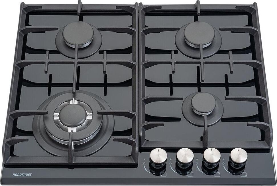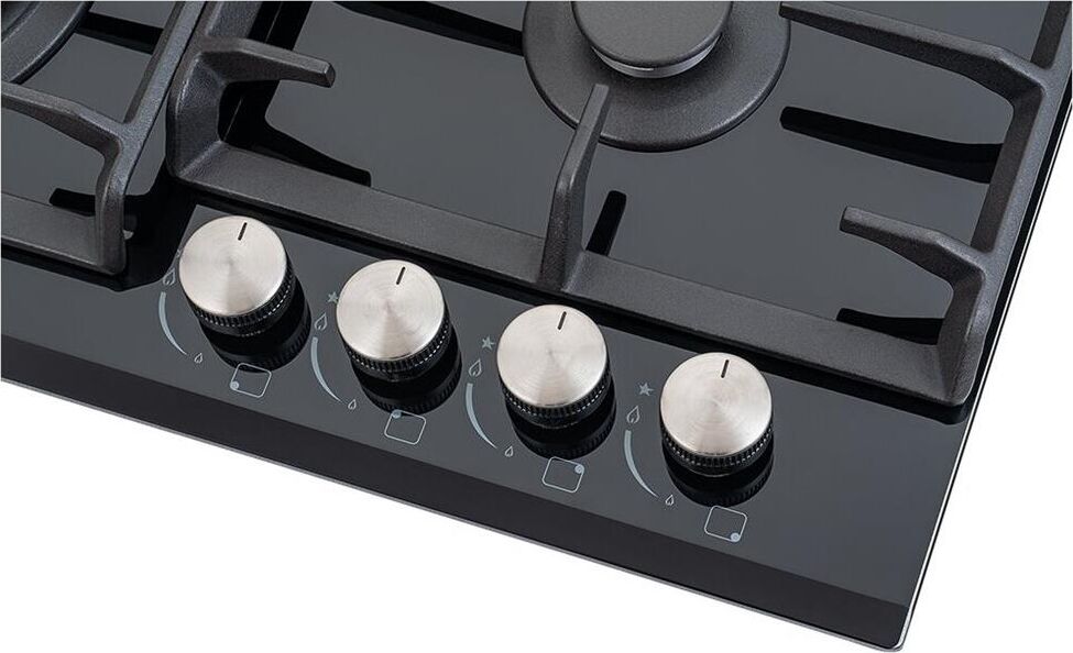 ШхГхВ: 58,4х51х10 см; электроподжиг; решетка: чугунная; WOK конфорка; цвет поверхности: черное закаленное стекло; цвет ручек: серебристые