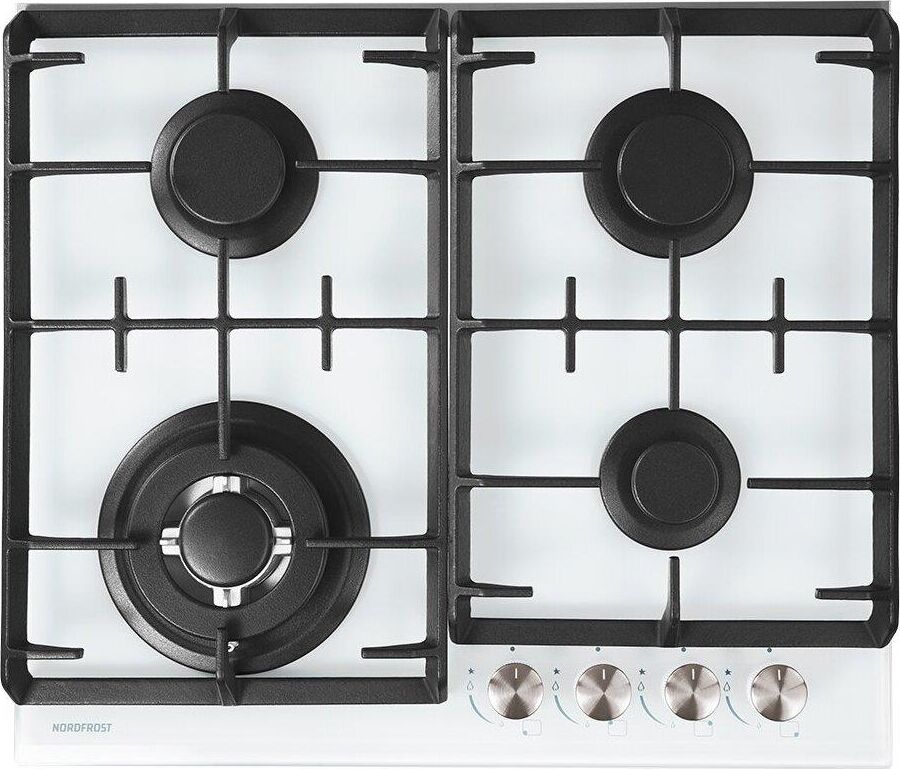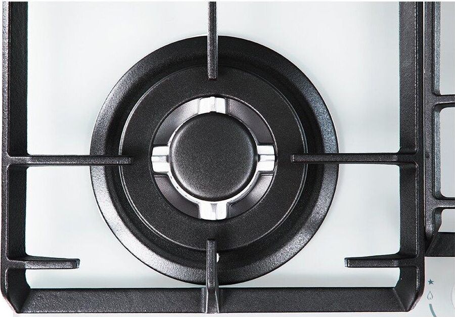 ШхГхВ: 58,4х51х10 см; электроподжиг; решетка: чугунная; WOK конфорка; цвет поверхности: белое закаленное стекло; цвет ручек: серебристые
