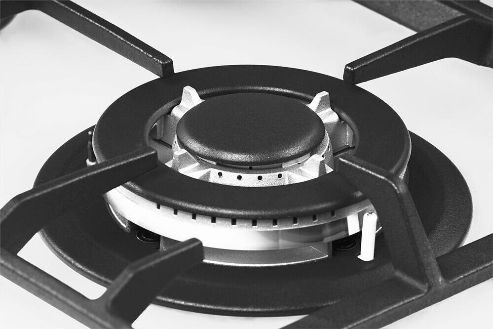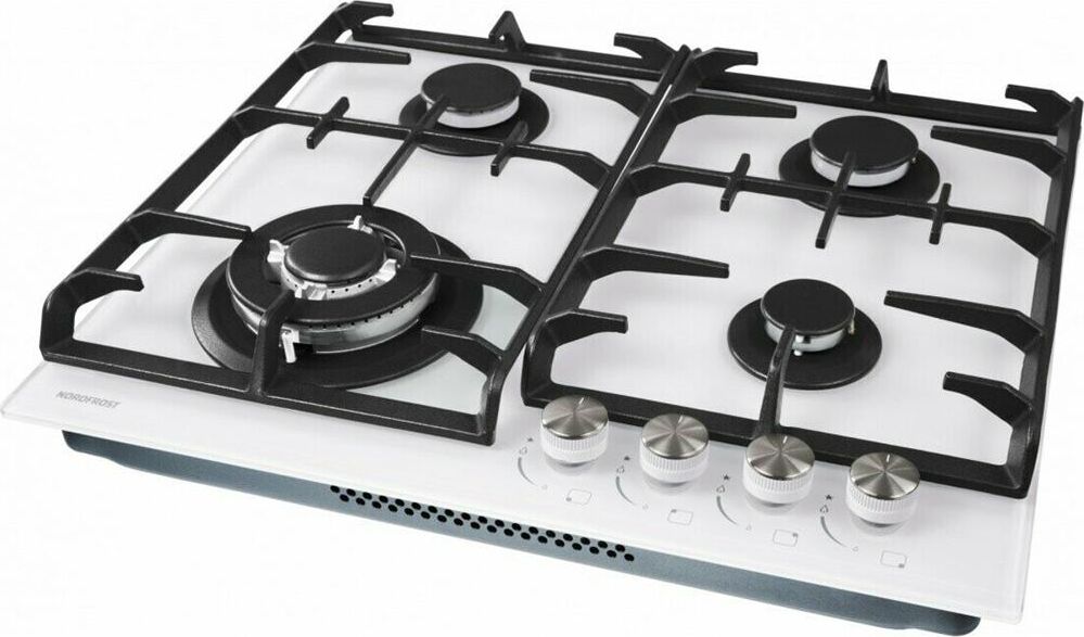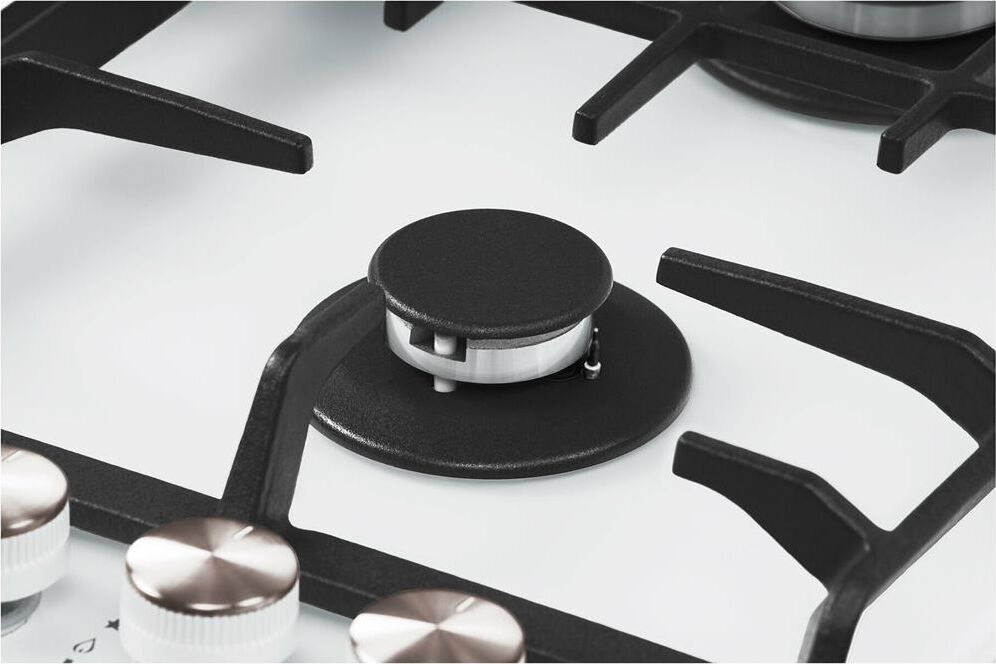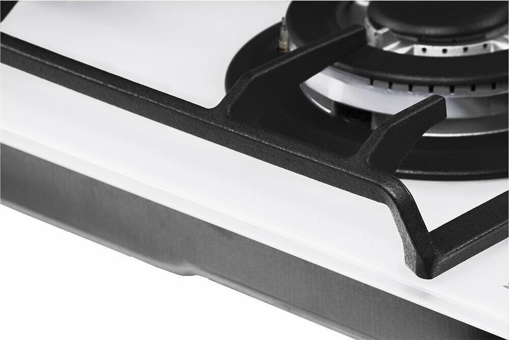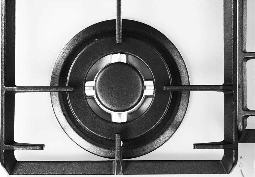 Цвет — белый, поверхность — закаленное стекло, толщина стекла 8 мм, WOK – конфорка, газ-контроль,электророзжиг, чугунные решетки, Количество газовых конфорок -4 шт., В х Ш х Г, 10 х 58 х 50 см