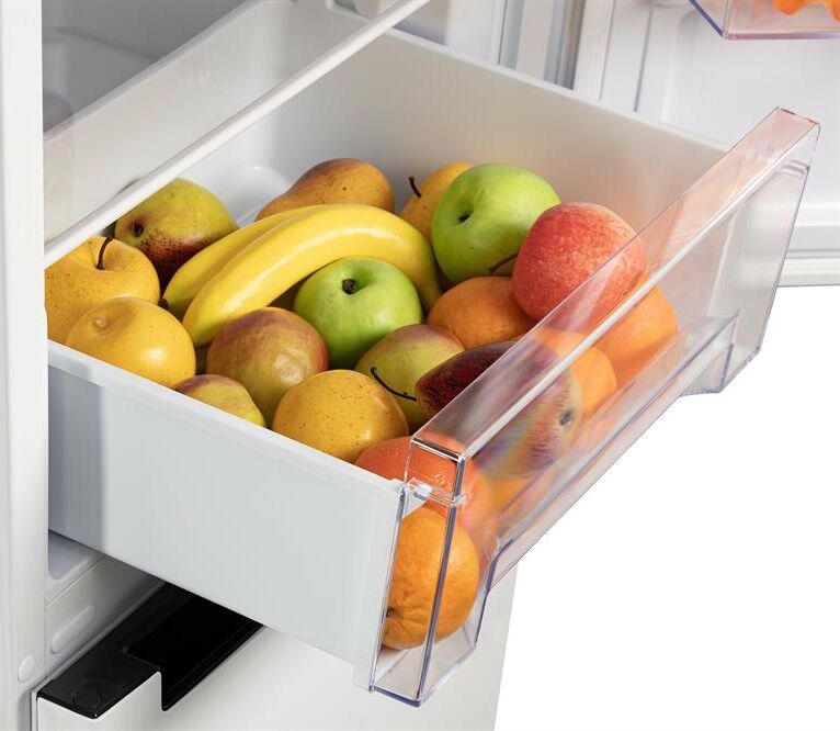 2-камерный, 338 л (ХК 238 л + МК 100 л), класс А+, LED-освещение, МК внизу, 4 полки стекло, 1 овощной ящик, 3 отделения в МК, автоматическая система оттаивания, 197,7х57,4х62,5 см, цвет: белый