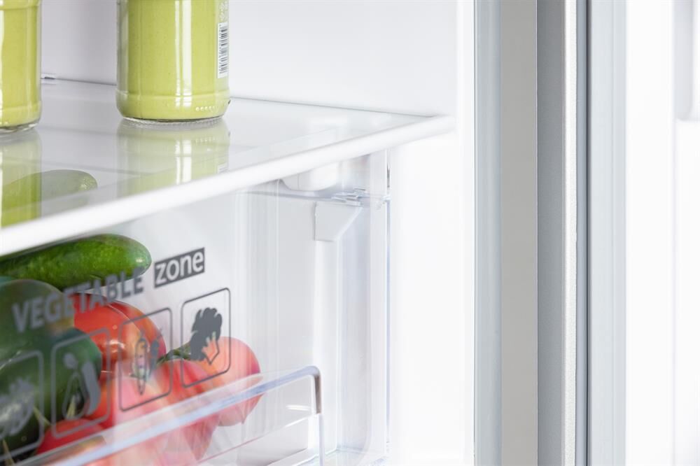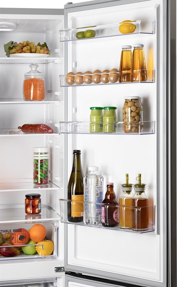 NEW! 2-камерный, 343 л (ХК 238 л + МК 105 л), класс А+, LED-освещение, МК внизу, 4 полки стекло, выдвижной овощной ящик, 3 отделения в МК, автоматическая система оттаивания, 203х57х62 см, цвет: серебристый