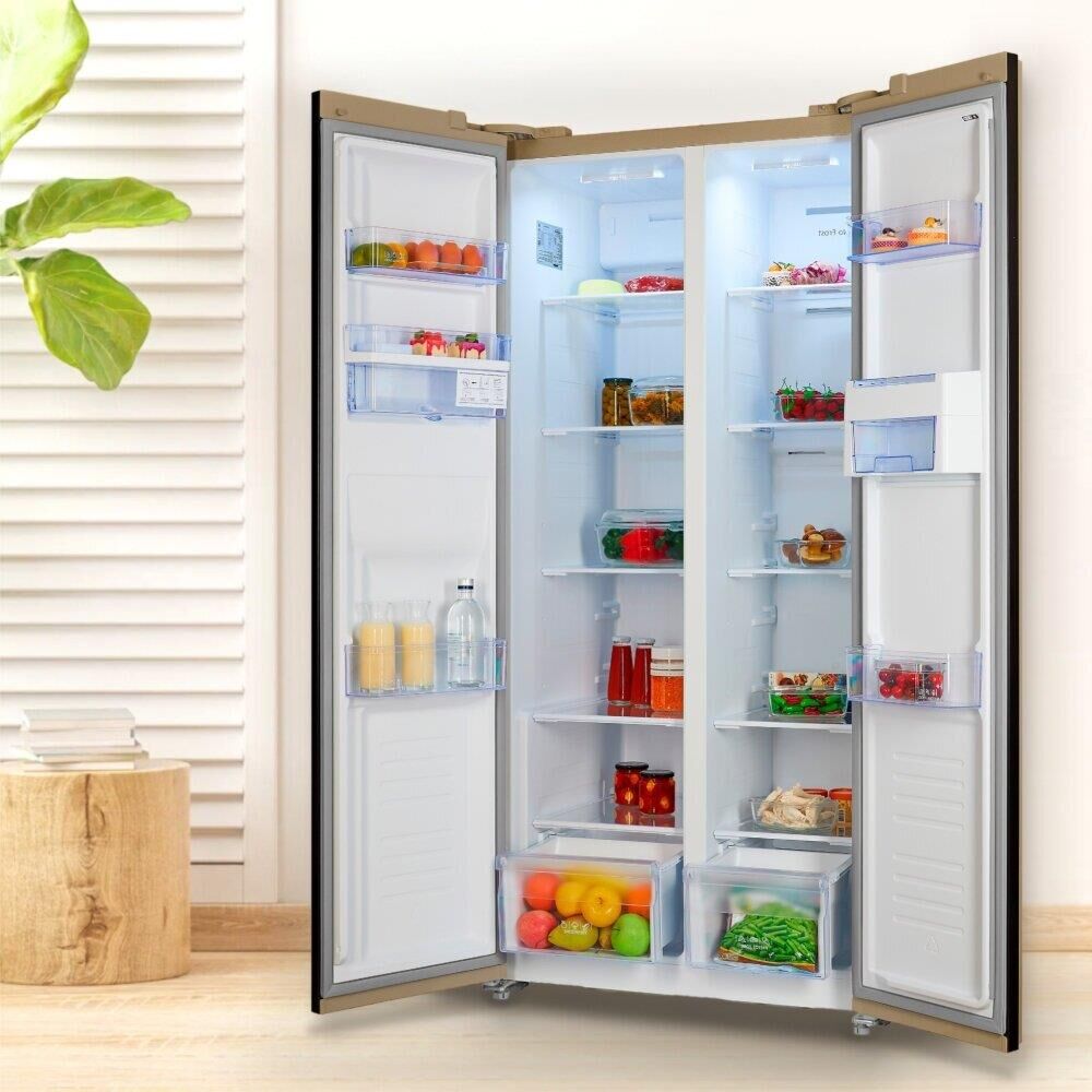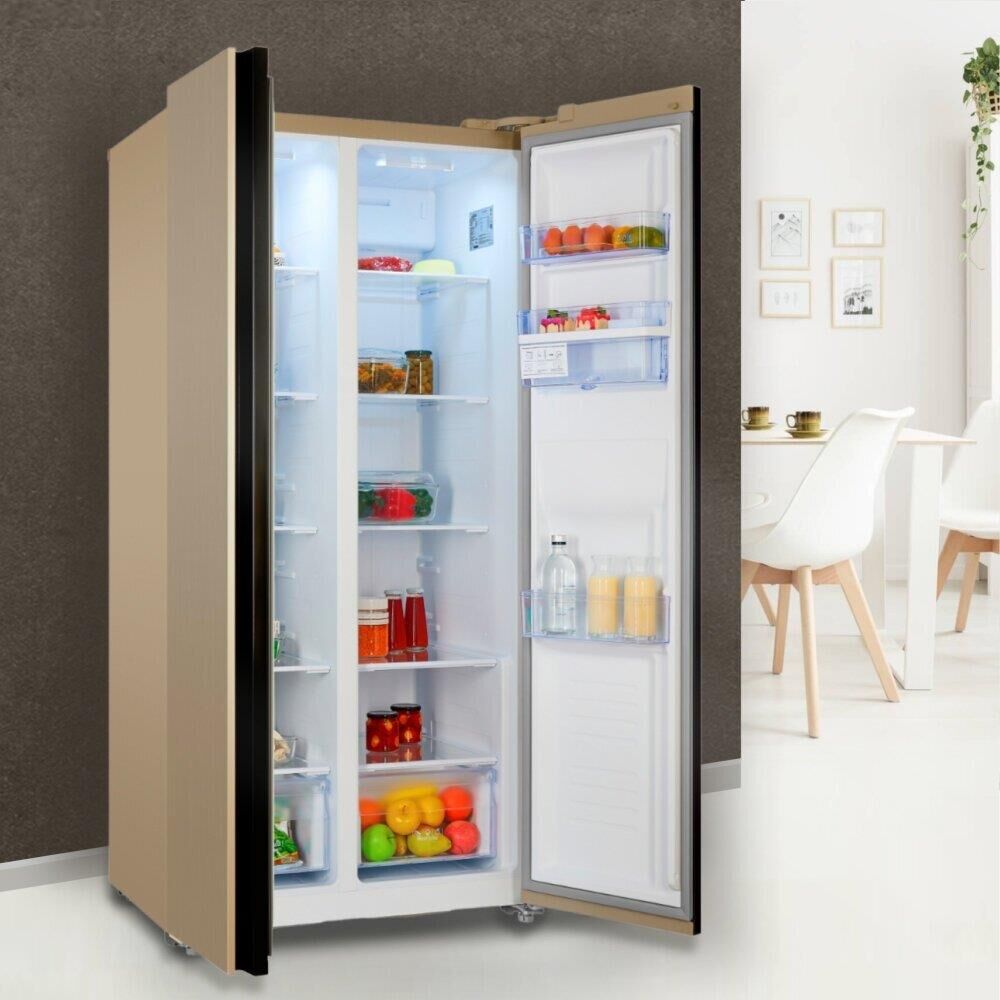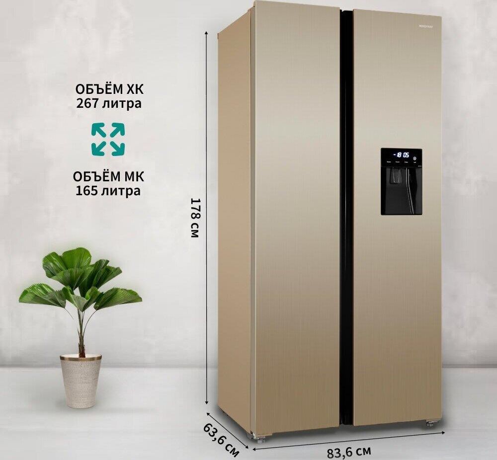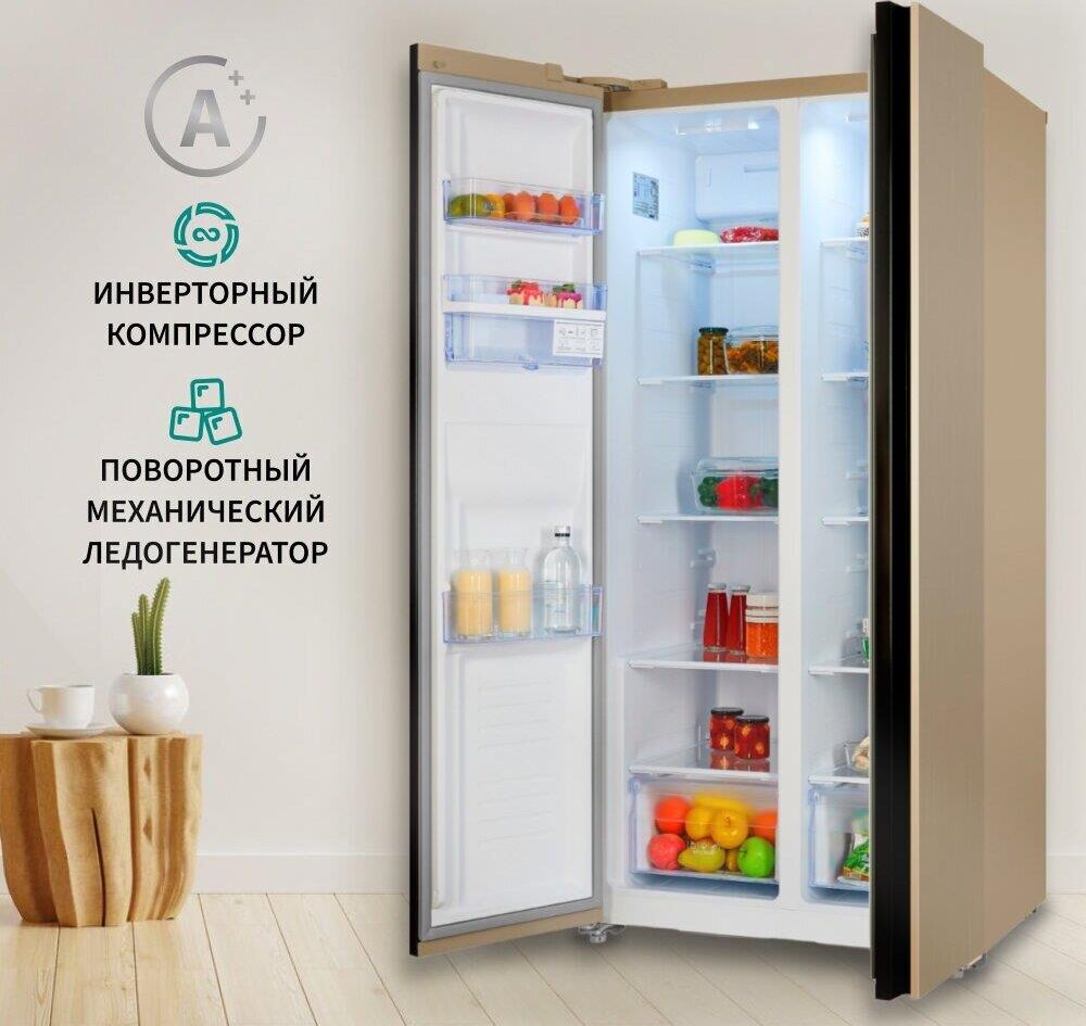 INVERTER compressor, NoFrost; Side-by-side ; V=472/432 л (267л/165л); Класс A++; Фреон R600a; Клим. кл. SN, T; 42 дБ; LED освещение. Электронный дисплей. Цвет: Шампань