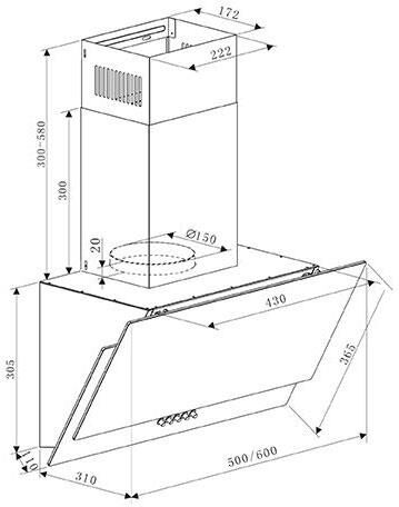 Черный, Ширина 500мм, Воздушный поток 750 м /ч, 2 LED лампы, Мощность освещения 2×3 Вт, 1 aлюминиевый фильтр, необходимое количество угольных фильтров — 2 шт, Модель угольного фильтра VU-02, Уровень шума 44 дБ, кнопочное управление, Вес нетто 8,4 кг, Турция