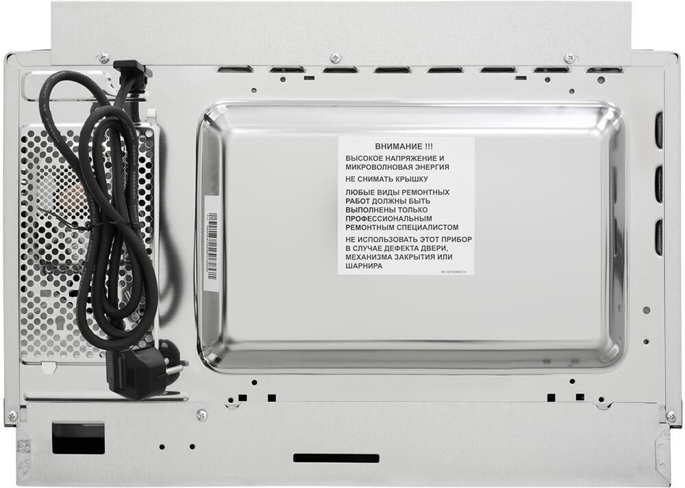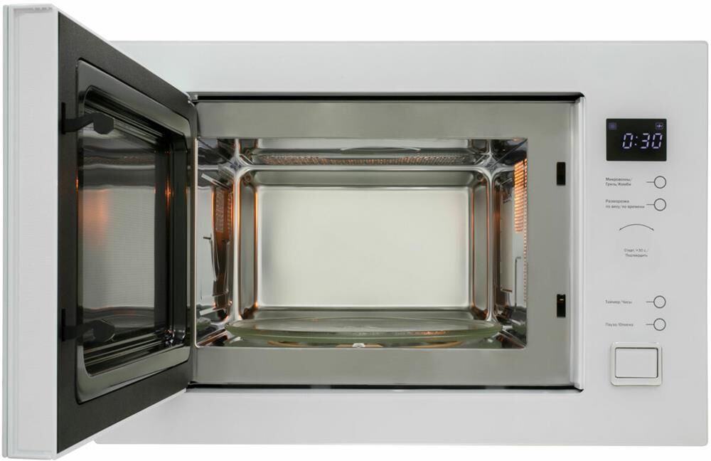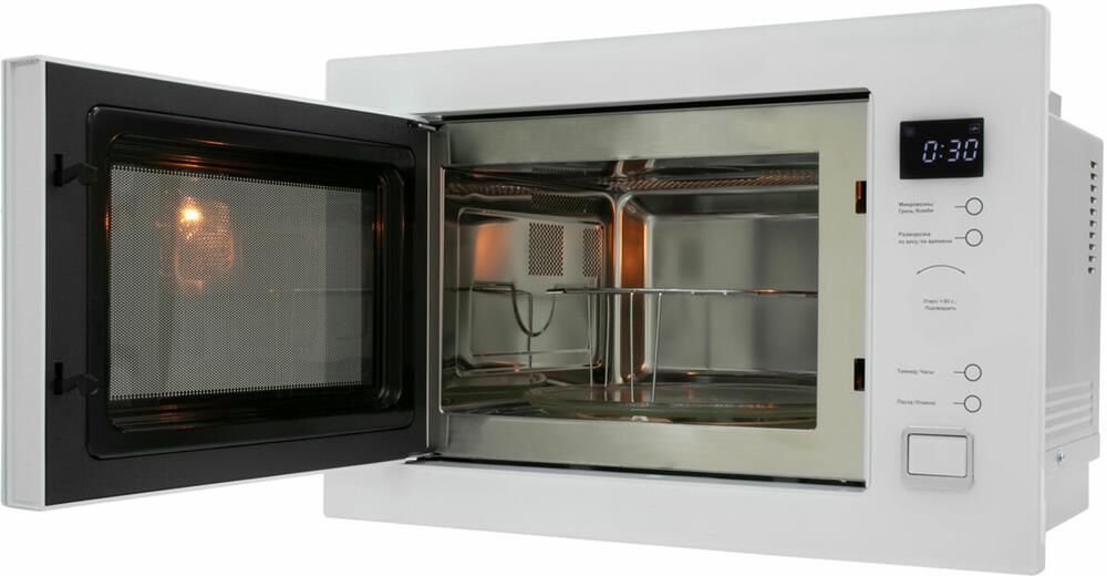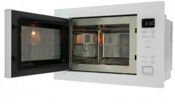 Объем: 25. Мощность микроволн: 900. Тип управления: электронное. Открывание дверцы: кнопка. Направление открытия дверцы: справа-налево. Внутреннее покрытие камеры: нержавеющая сталь. Диаметр поворотного стола: 315. Мощность гриля: 1000. Тип гриля: тэновый. Цвет корпуса: белый. Вес (нетто): 19.5. Габариты упаковки (ед) ДхШхВ: 0.685×0.565×0.475. Вес упаковки (ед): 22. Страна производства: Китай. Внутреннее освещение: есть. Количество программ: 8. Количество ступеней регулировки мощности: 5. Таймер на отключение, макс. время: 95. Язык панели управления: русский. Гарантия: 12 мес.. Размеры (ШхВхГ): 59.5 х 38.8 х 40 см. Размеры ниши (ШхВхГ): 56 х 38 х 50 см. Функции: блокировка от детей. Дополнительные режимы: размораживание по весу, режим микроволны+гриль. Особенности управления: звуковой сигнал окончания приготовления, кнопка +30 секунд, пауза, регулировка мощности. Комплектация: решетка для гриля. Режимы: автоматическая разморозка, гриль. Особенности корпуса: дисплей, часы. Мощность: 900 Вт. Тип управления: эле