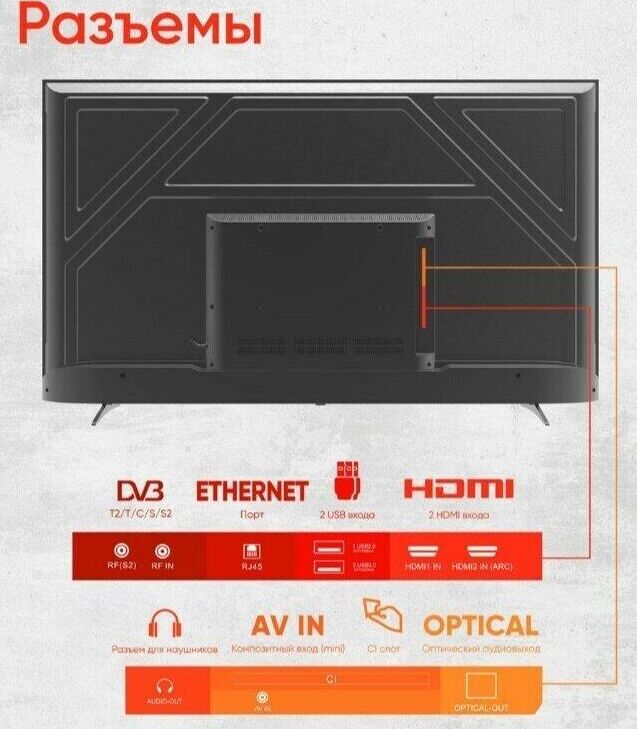 Светодиодная подсветка (LED) Диагональ экрана: 109 см Разрешение экрана: 3840 x 2160 пикселей Прием аналогового сигнала: PAL/SECAM Прием цифрового сигнала DVB-T2/T/C/S/S2 Smart TV (доступ в интернет), Wildred (Atlas – Family), ОС: Android 11, Wi-Fi Воспроизведение аудио-, фото- и видеофайлов через USB Стереозвук NICAM, Dolby Digital Прогрессивная развертка Рабочее напряжение: ~100–240 B, 50 Гц Цвет: черный